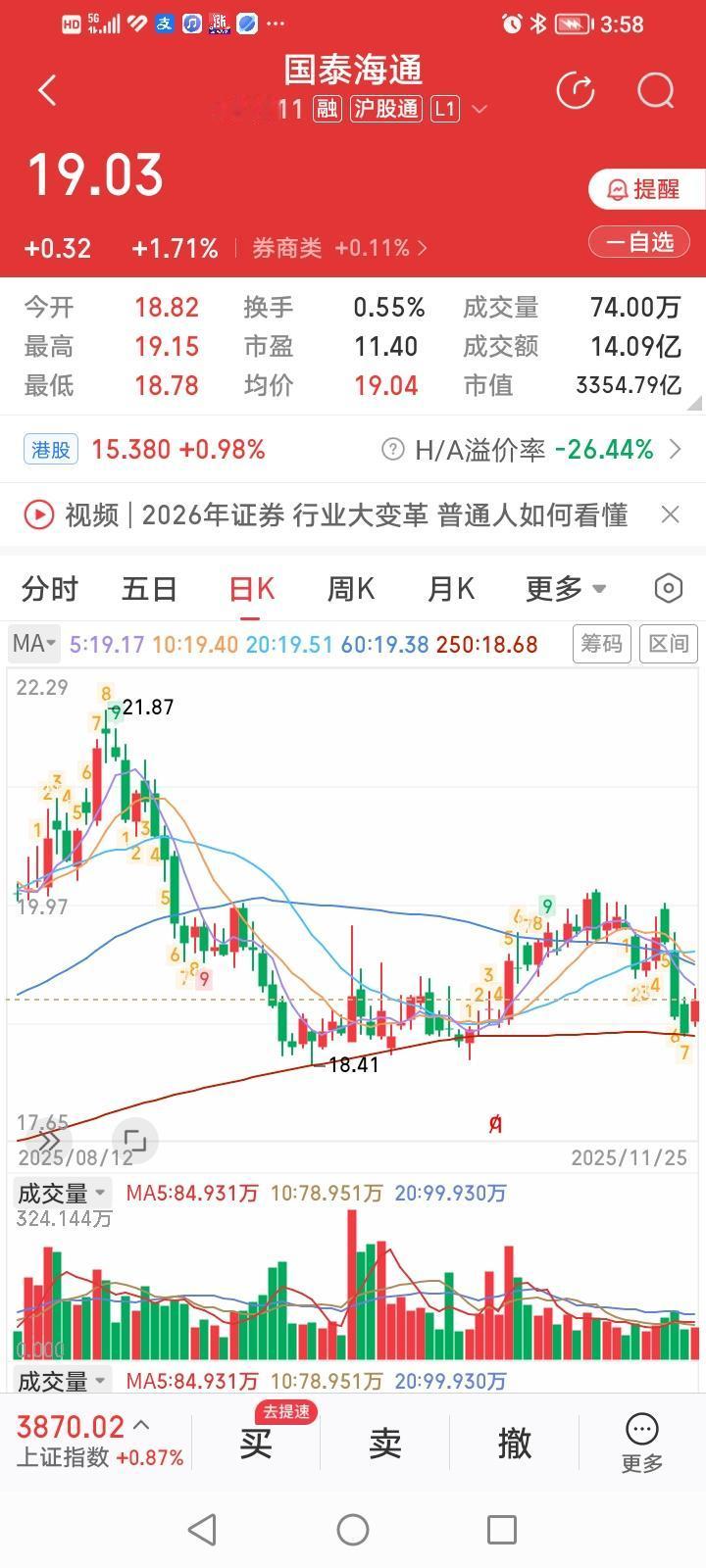 国泰海通,涨势汹汹!国泰海通今天收盘怒张1.71%,涨幅居券商股涨幅排行榜第三名,算是在涨幅平平的头部券商股中出了把风头。 国泰海通今天成交金额14.09亿元,并未显著放量,所以充其量今天的上涨也就是个超跌反弹吧! 国泰海通目前年线在18.68元,短短一个月前后国泰海通已经两度回踩年线了,这次能否守住年线呢?