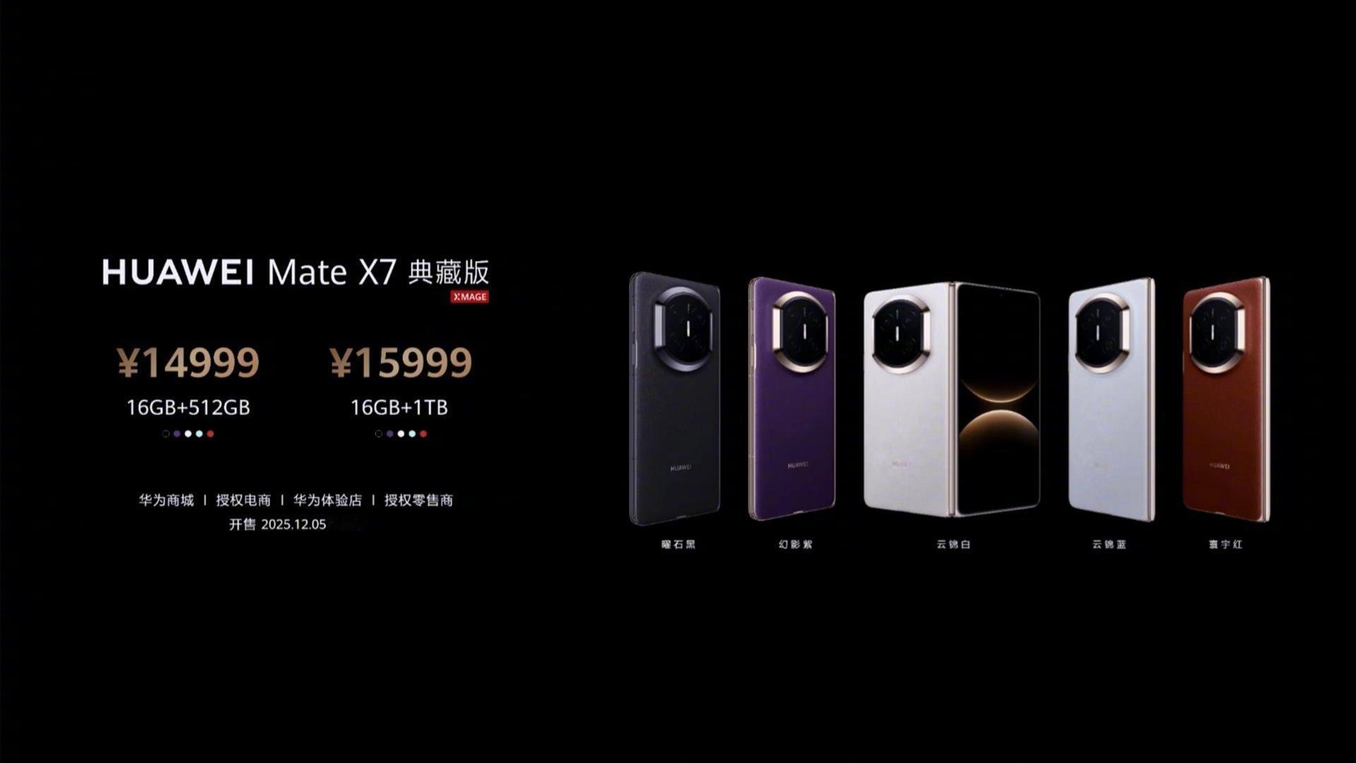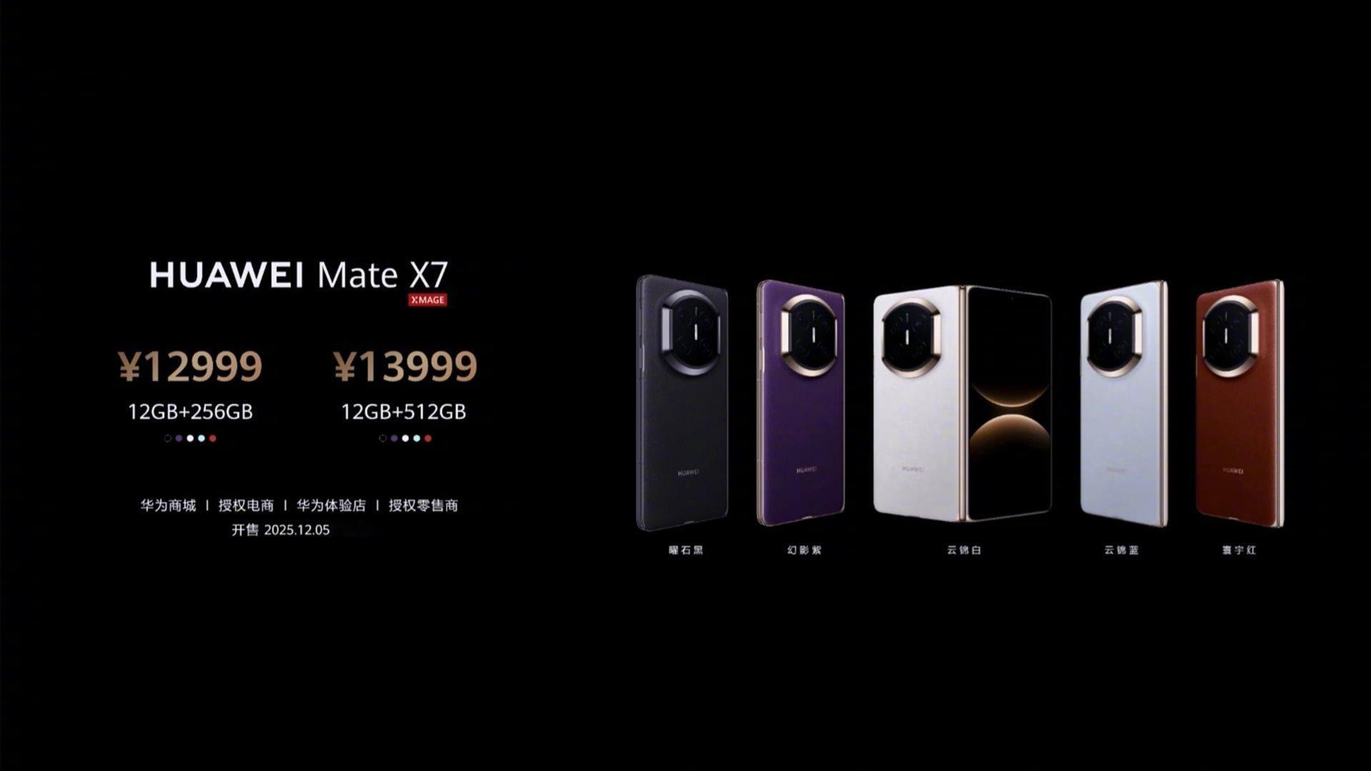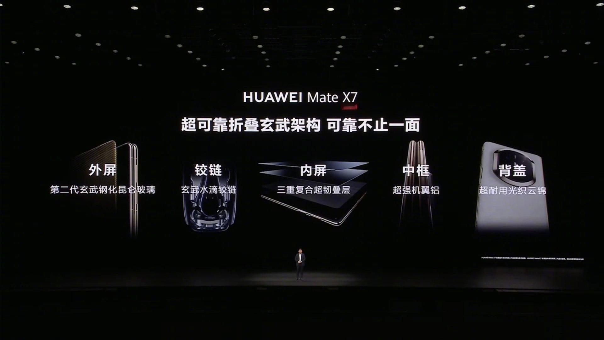 华为正式发布全新折叠旗舰 —— HUAWEI Mate X7。以玄武架构带来的极致可靠性、第二代红枫影像系统、HarmonyOS 6 的智慧体验与全新云锦美学设计,让折叠屏真正迈入“主力旗舰时代”。外观方面,Mate X7 采用升级的玄武水滴铰链结构,核心部件为 2350MPa 火箭钢,实现更高强度与更稳定的折叠可靠性。整机通过热水喷淋、石子路面跌落等严苛测试,耐冲击性提升 300%,折叠屏“不耐造”的刻板印象被彻底打破。外屏覆盖第二代玄武钢化昆仑玻璃,内屏采用三重复合超韧叠层结构,将折痕深度压至约 10 微米,展开观感近乎无痕。机身支持 IP58/59 级防尘防水,进一步提升极端场景下的使用安心度。背板融入南京云锦工艺,以微米级蚀刻呈现金属光影纹理,在科技美学里加入文化温度。整机展开厚度 4.5mm、折叠态 9.5mm,重量仅 235g,相比上代更轻更便携。影像方面,Mate X7 搭载第二代红枫影像系统,重点解决混合光源偏色与复杂光线下的色准表现,进光量提升 96%、色彩还原能力提升 43%,动态范围最高可达 17.5EV。主摄配备 1/1.28 英寸大底,提供 F1.4–F4.0 十档物理可变光圈,满足从夜景到抓拍的全场景需求。潜望长焦升级为 50MP RYYB 方案,支持 3.5× 光变与 7× 品质变焦,并首次在折叠屏上实现“长焦微距慢动作”,辅以 40MP 超广角与红枫原色副摄,实现更全面的焦段覆盖。四切边镜组与 0.4mm 超薄玻璃镜片的运用,让画质与轻薄机身同时兼顾。性能方面,Mate X7 搭载麒麟9030芯片(典藏版提供 20GB 运行内存),在能效与调度上全面进化,多任务与大屏生产力体验显著提升。系统首发 HarmonyOS 6,带来更低时延的操作逻辑,以及更完善的大屏交互:分屏操作更顺畅,文档拖拽、手写批注与跨设备流转等能力进一步加强。基于 A2A 智能体技术,小艺助手首次具备跨应用任务协作能力,一句话即可完成如“订票+选座+订餐”完整链路操作,使折叠大屏的效率价值进一步释放。设计与体验层面,Mate X7 的折叠交互、影像能力与坚固性实现全维度提升,从“能折”走向“好用、耐用、能依赖”。在折叠屏增长迅速的当下,Mate X7 通过真实可靠的产品力,让折叠屏从“技术尝鲜品”演变为“主力旗舰选择”。价格信息如下:HUAWEI Mate X7 12GB+256GB 12999元HUAWEI Mate X7 12GB+512GB 13999元HUAWEI Mate X7 16GB+512GB 14999元HUAWEI Mate X7 16GB+1TB 15999元HUAWEI Mate X7 手写笔套装 20GB+1TB 17999元