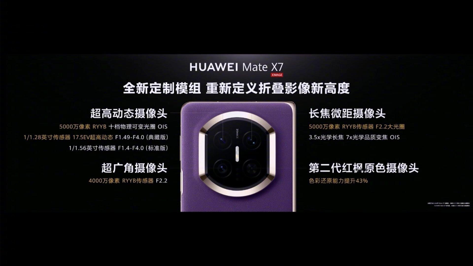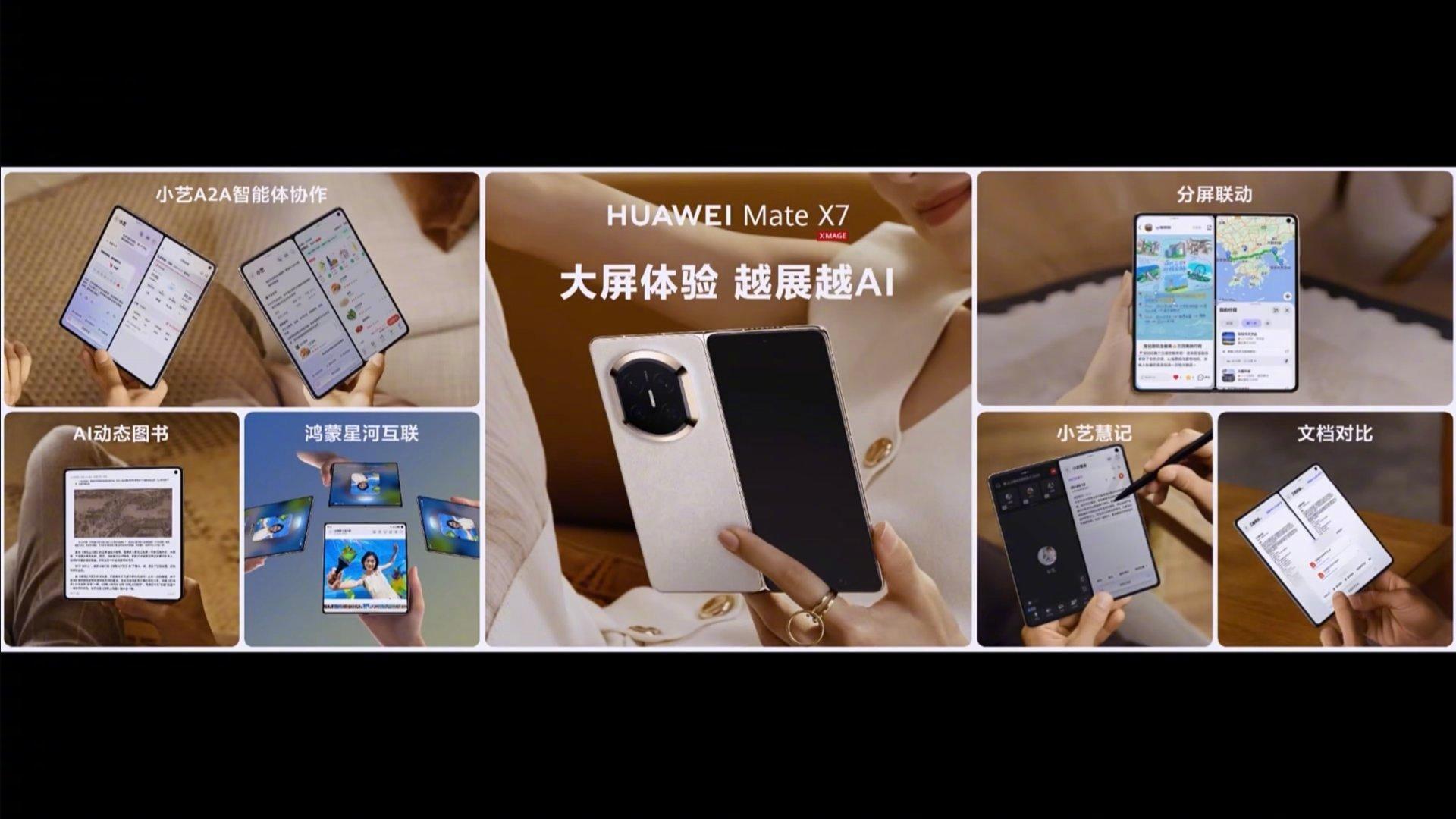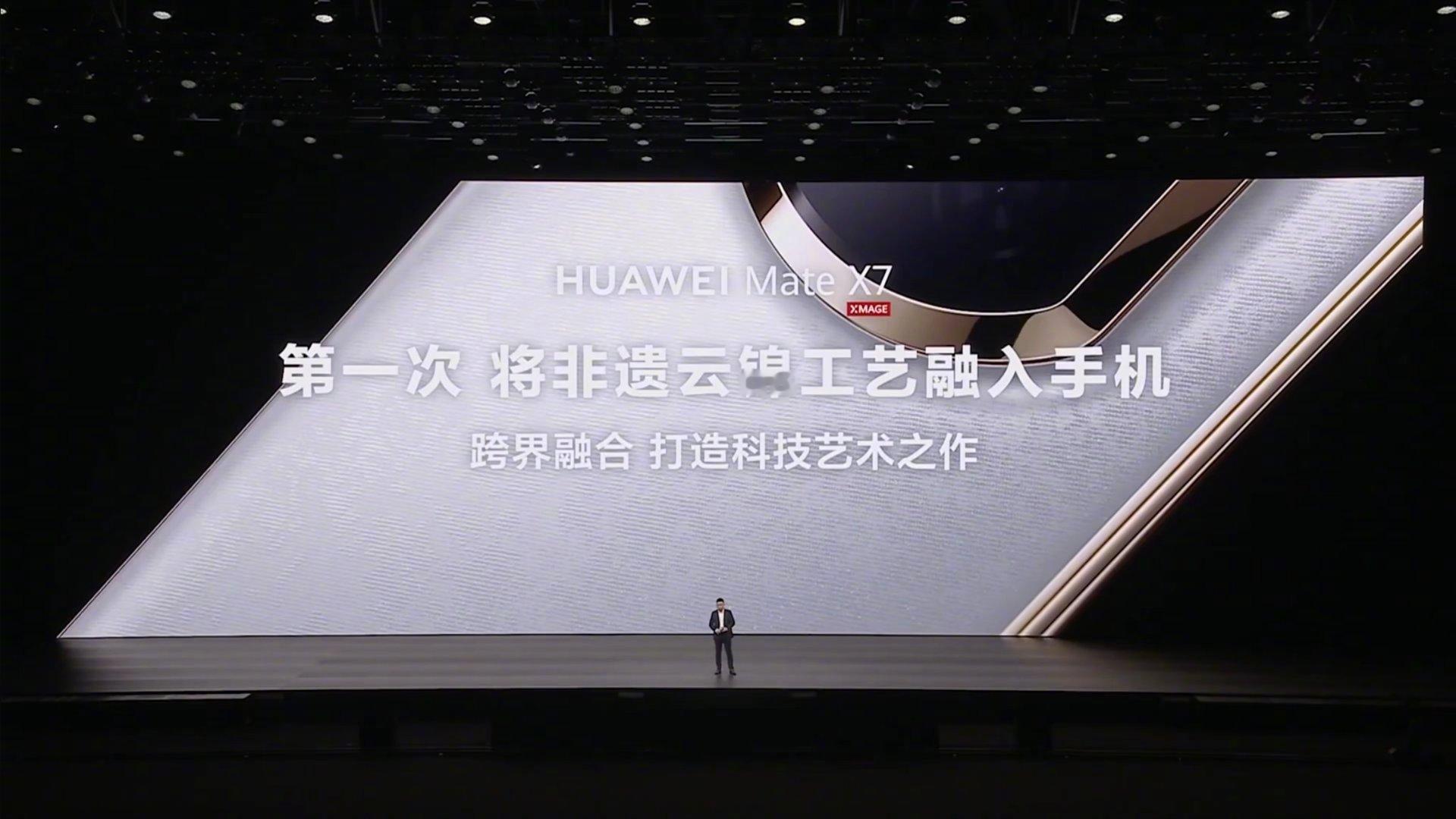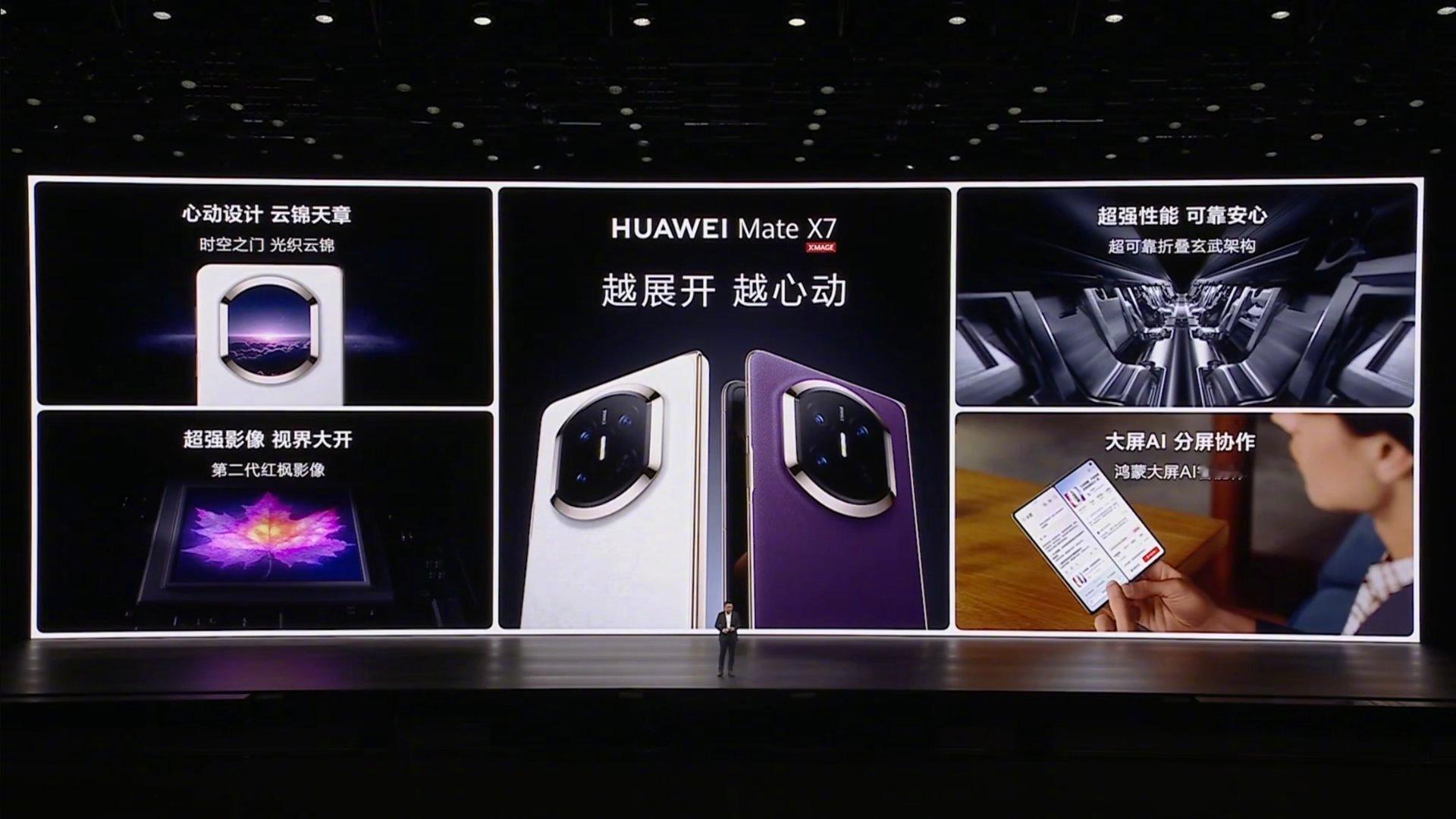 华为正式发布全新折叠旗舰 —— HUAWEI Mate X7。以玄武架构带来的极致可靠性、第二代红枫影像系统、HarmonyOS 6 的智慧体验与全新云锦美学设计,让折叠屏真正迈入“主力旗舰时代”。外观方面,Mate X7 采用升级的玄武水滴铰链结构,核心部件为 2350MPa 火箭钢,实现更高强度与更稳定的折叠可靠性。整机通过热水喷淋、石子路面跌落等严苛测试,耐冲击性提升 300%,折叠屏“不耐造”的刻板印象被彻底打破。外屏覆盖第二代玄武钢化昆仑玻璃,内屏采用三重复合超韧叠层结构,将折痕深度压至约 10 微米,展开观感近乎无痕。机身支持 IP58/59 级防尘防水,进一步提升极端场景下的使用安心度。背板融入南京云锦工艺,以微米级蚀刻呈现金属光影纹理,在科技美学里加入文化温度。整机展开厚度 4.5mm、折叠态 9.5mm,重量仅 235g,相比上代更轻更便携。影像方面,Mate X7 搭载第二代红枫影像系统,重点解决混合光源偏色与复杂光线下的色准表现,进光量提升 96%、色彩还原能力提升 43%,动态范围最高可达 17.5EV。主摄配备 1/1.28 英寸大底,提供 F1.4–F4.0 十档物理可变光圈,满足从夜景到抓拍的全场景需求。潜望长焦升级为 50MP RYYB 方案,支持 3.5× 光变与 7× 品质变焦,并首次在折叠屏上实现“长焦微距慢动作”,辅以 40MP 超广角与红枫原色副摄,实现更全面的焦段覆盖。四切边镜组与 0.4mm 超薄玻璃镜片的运用,让画质与轻薄机身同时兼顾。性能方面,Mate X7 搭载麒麟9030芯片(典藏版提供 20GB 运行内存),在能效与调度上全面进化,多任务与大屏生产力体验显著提升。系统首发 HarmonyOS 6,带来更低时延的操作逻辑,以及更完善的大屏交互:分屏操作更顺畅,文档拖拽、手写批注与跨设备流转等能力进一步加强。基于 A2A 智能体技术,小艺助手首次具备跨应用任务协作能力,一句话即可完成如“订票+选座+订餐”完整链路操作,使折叠大屏的效率价值进一步释放。设计与体验层面,Mate X7 的折叠交互、影像能力与坚固性实现全维度提升,从“能折”走向“好用、耐用、能依赖”。在折叠屏增长迅速的当下,Mate X7 通过真实可靠的产品力,让折叠屏从“技术尝鲜品”演变为“主力旗舰选择”。价格信息如下:HUAWEI Mate X7 12GB+256GB 12999元HUAWEI Mate X7 12GB+512GB 13999元HUAWEI Mate X7 16GB+512GB 14999元HUAWEI Mate X7 16GB+1TB 15999元HUAWEI Mate X7 手写笔套装 20GB+1TB 17999元