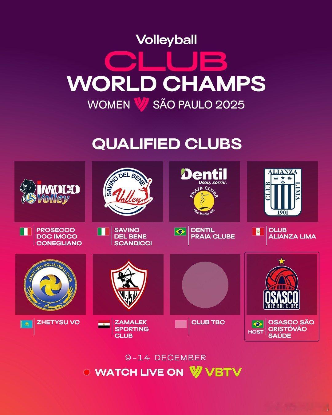 【2025女排世俱杯赛程】▶小组赛科内利亚诺vs美国奥兰多女武神 12月10日(三) 00:30科内利亚诺vs埃及扎马雷克 12月11日(四) 04:00科内利亚诺vs巴西乌贝兰迪亚海滩 12月12日(五) 00:30▶半決赛.第一场 12月13日(六) 23:55.第二场 12月14日(日) 03:30▶季军战·12月14日(日) 23:55▶冠军战·12月15日(一) 03:30