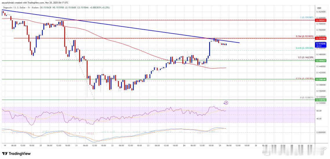 狗狗币最近又开演行情大片了!从0.133一路拉升,突破0.14和0.142,短线趋势还算强。不过现在到了0.153—0.154附近,多头开始遇到硬钉子,上方压力不小,图上还有条下降趋势线正顶着。如果突破不了,可能会回踩0.146甚至0.142。相反如果强势突破0.154并站稳,那下一目标有望直指0.159、0.165甚至更高。总之,现在就是关键分水岭,盯好这个区间,狗狗币接下来走强还是回落,就看它能不能打穿这道压力墙了!