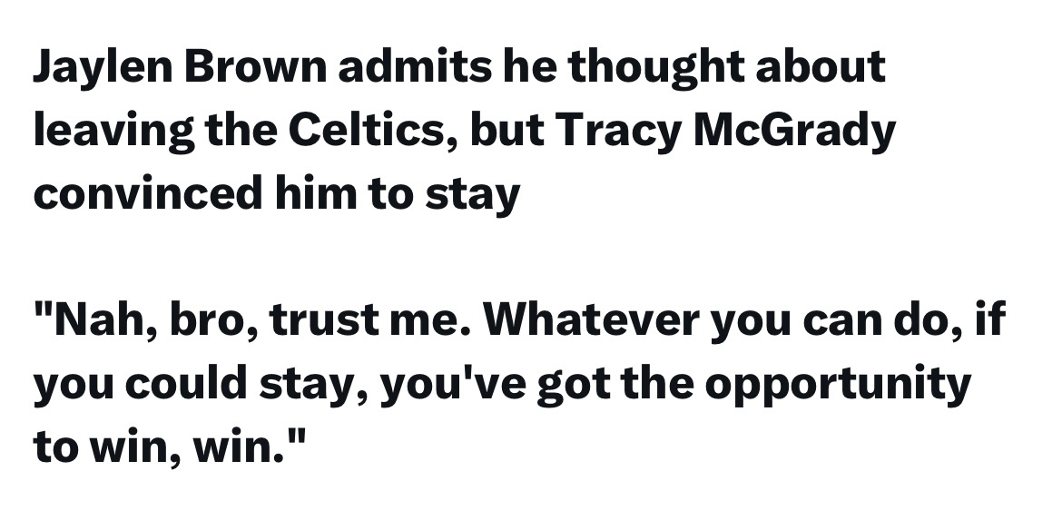 杰伦-布朗透露自己考虑过离开凯尔特人,但麦迪劝他留下。麦迪说:“兄弟,相信我,留下来,你就有机会夺冠。”不愧是恩师。