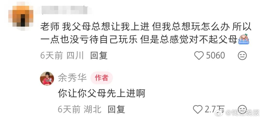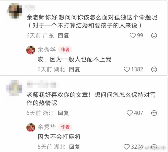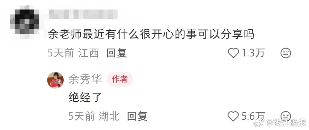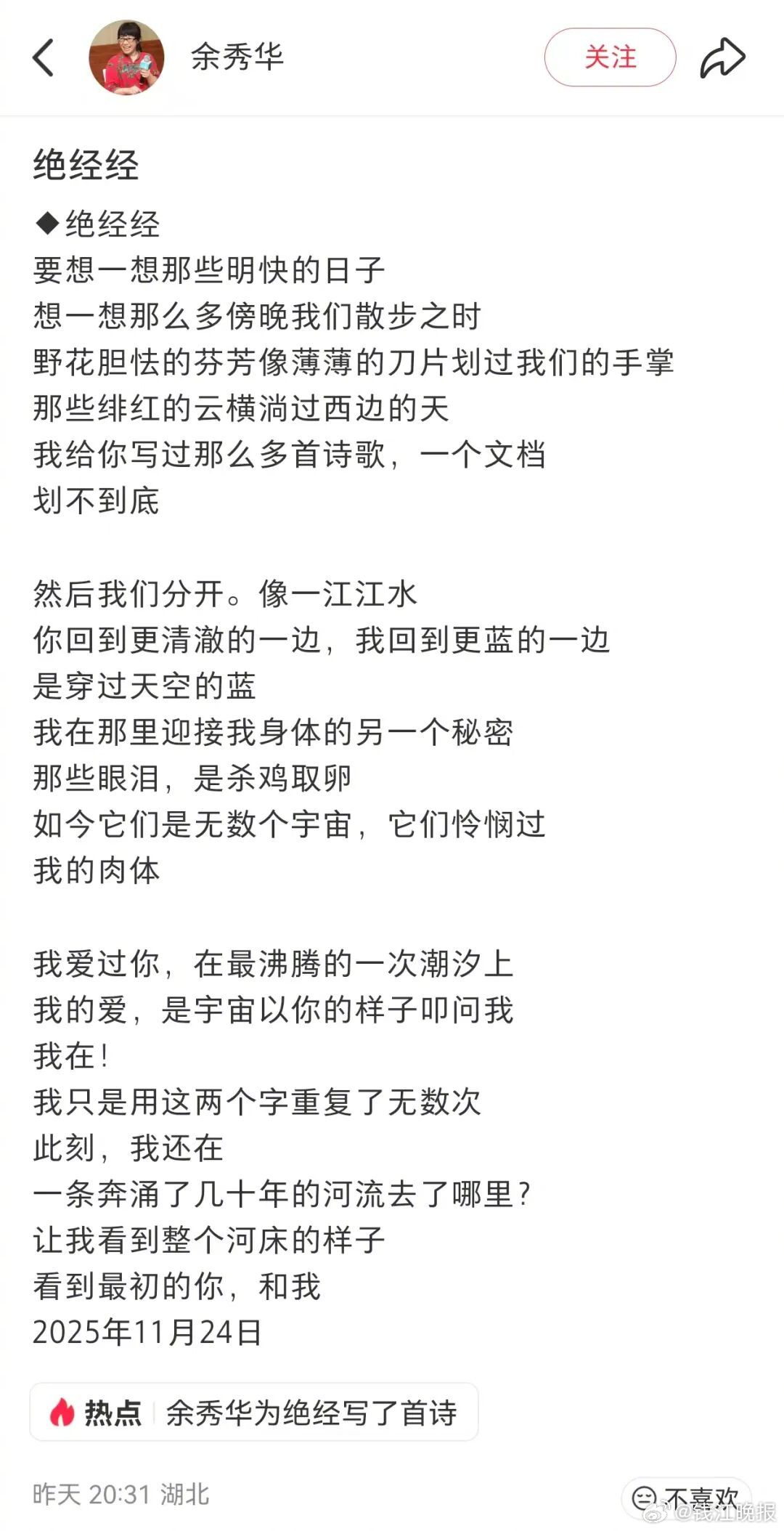 【49岁余秀华为绝经写了首诗《绝经经》,坦言很开心,网友“笑晕”在评论区】 “余老师,最近有什么很开心的事可以分享吗?”近日,有网友在诗人余秀华的社媒评论区留言。“绝经了。”余秀华回复。这一耿直的答案,让不少网友调侃“绝了”,5天不到,便收获5万多个点赞。于是,余秀华诗意大发,11月24日发布了一首《绝经经》↓↓余秀华开帖与网友互动幽默 回复太有梗11月19日,余秀华在社媒开帖介绍自己:大家好,我是诗人余秀华 ,出版过几本诗集和散文集。平时除了写作,我还喜欢养花、撸猫、喝茶、刷短视频,跟喜欢的人聊天。有关诗歌、写作和生活的任何问题,欢迎跟我交流!帖子一发,引来大批网友留言互动。翻看她的评论区,有不少“尽显回答的艺术”的回复。有网友问:余老师,最近冷,怎么应对天一冷起来就伤心?余秀华答:穿上羽绒服。有网友问:老师,最近被断崖式分手,一直忘不掉他怎么办?余秀华答:所有断崖式分手都是预谋已久,别自己骗自己了。有网友问:老师,我父母总想让我上进,但我总想玩怎么办?总感觉对不起父母。余秀华答:你让你父母先上进啊!有网友问:请问二三十岁的年纪,该听父母的安排,还是追随自己内心选择的路?余秀华答:你这个问题说明你没有主见,干脆听父母的。有网友问:余老师,怎样写出像你一样好的诗?余秀华答:要写出像你自己一样好的诗。余秀华仍在不断地回复网友,各种答案让人忍俊不禁。公开资料显示,余秀华,1976年出生于湖北省,当代女诗人、作家,患有先天性脑瘫。其代表作有《穿越大半个中国去睡你》《月光落在左手上》《摇摇晃晃的人间》等。(潮新闻·钱江晚报记者袁颖综合自、公开资料、网友评论等)