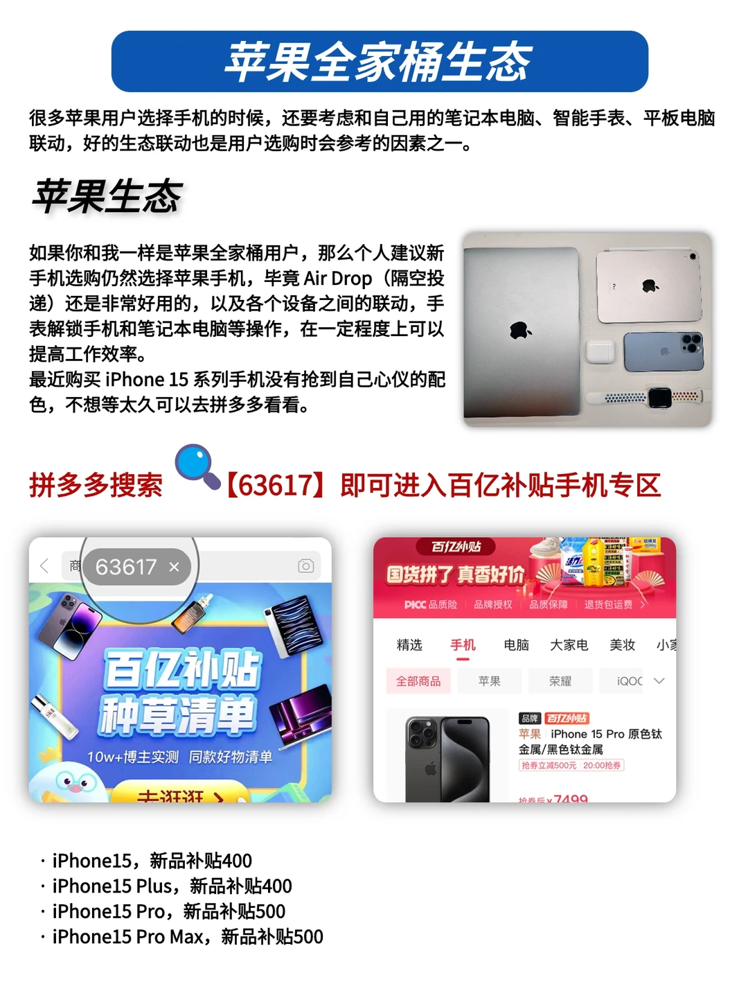 最近如果要购买苹果手机可以去 拼多多看看,价格有优惠至高补贴 701 元,在拼多多搜索 【63617】即可进入百亿补贴手机专区。