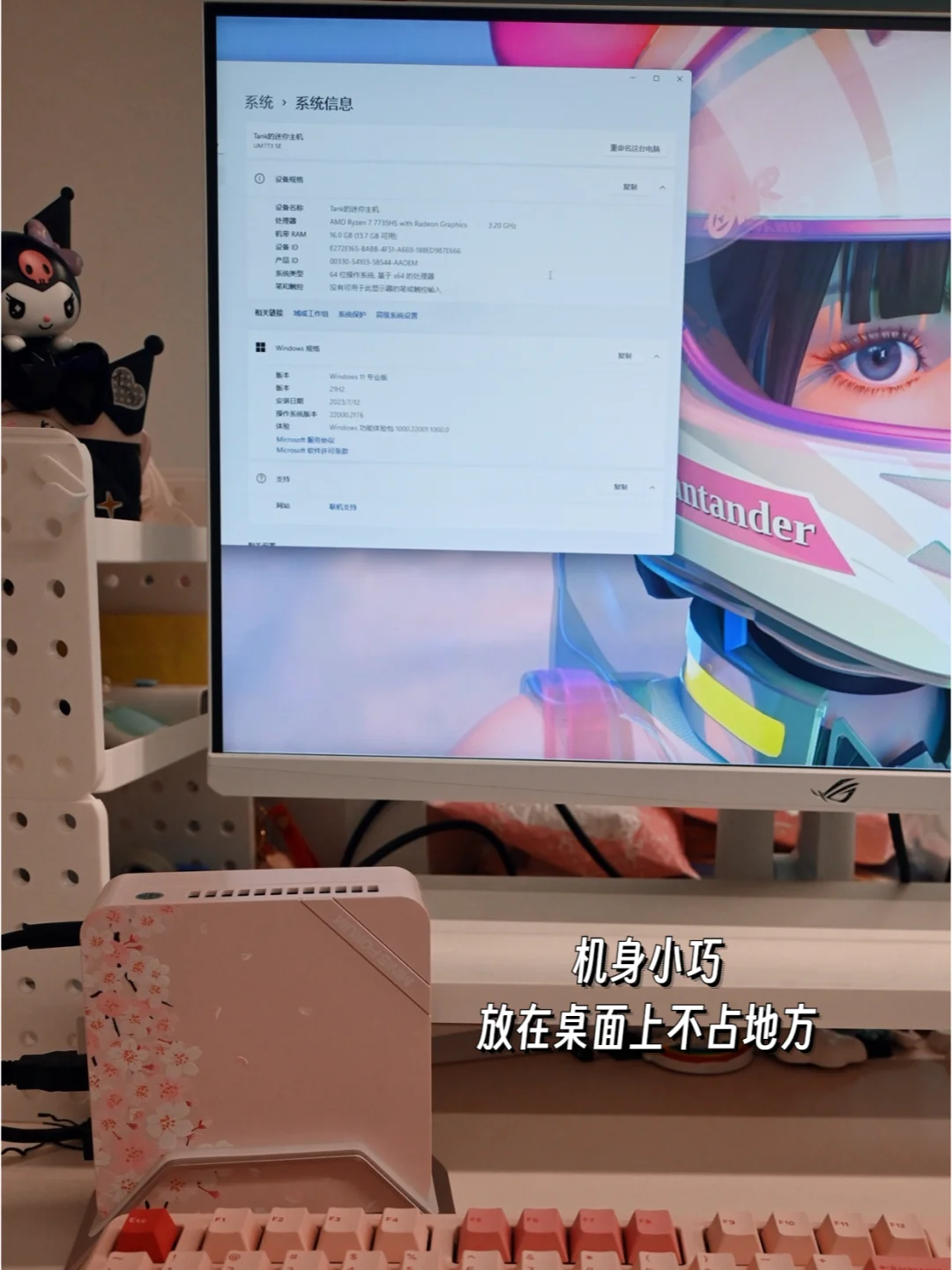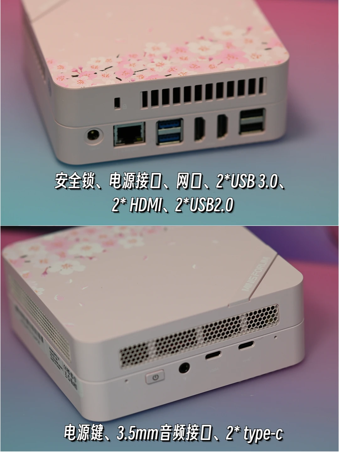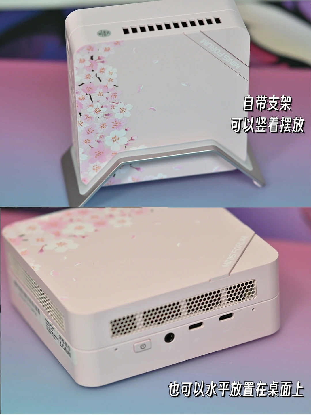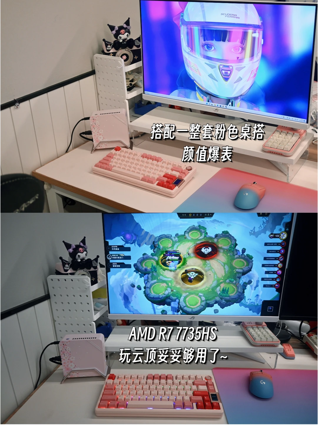 最近给女票桌面配了一套纯粉色的桌搭,一起来看下吧。 主机:铭凡樱花限定版 UM773 SE 鼠标:罗技 GPW BLG 限定 鼠标垫:罗技 BLG 限定玻璃垫 键盘:infi75 芭比粉 西子轴 迷你主机小巧,性能也不错,工作室里不想配太大的台式,没有外出办公需求的可以考虑这台迷你主机,日常办公、剪辑视频,休息下下棋打 LOL 、dota2 妥妥够用的。 接口丰富,四个方向都有散热口,自带金属支架可以竖着摆放不占用桌面空间,也可以横向摆放直接平躺放在桌面上,这台迷你主机安利给喜欢粉丝系的朋友~