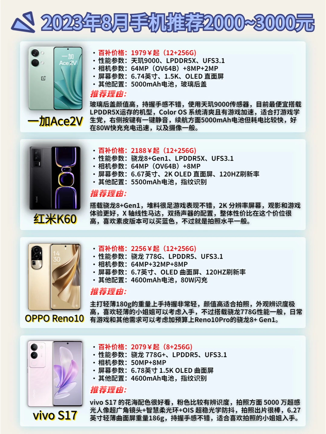 一加Ace2V、红米 K60、OPPO Reno10、vivo S17