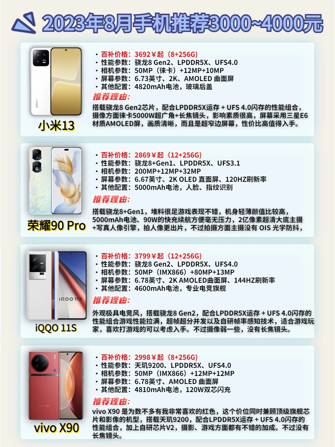 小米13、荣耀 90 Pro、iQOO 11S、vivo X90