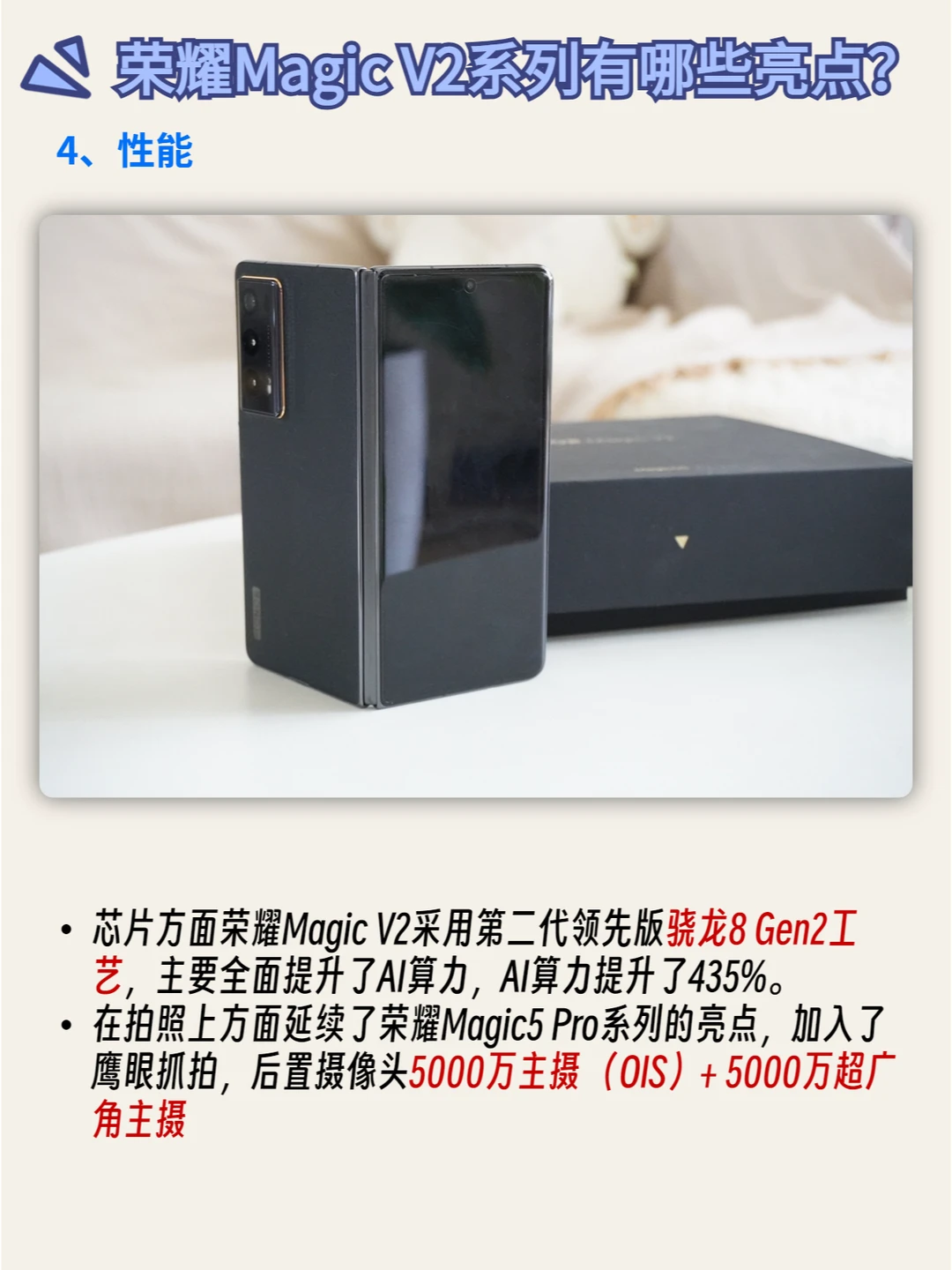 芯片方面荣耀Magic V2采用第二代领先版骁龙8 Gen2工艺,主要全面提升了AI算力,AI算力提升了435%。