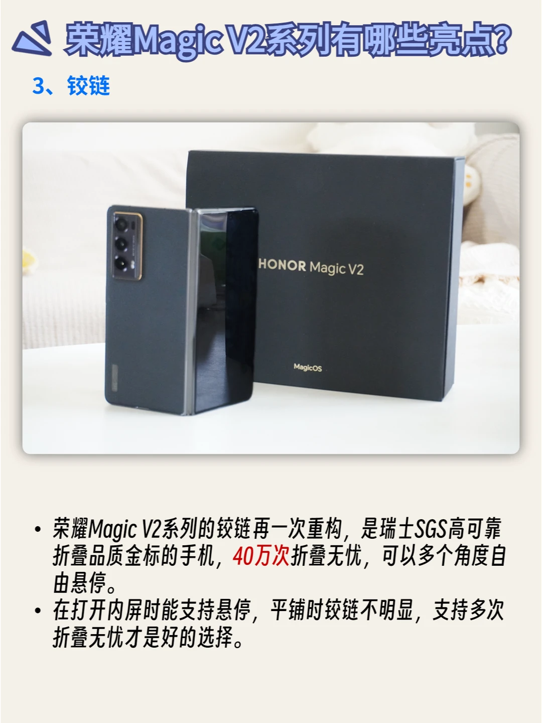 荣耀Magic V2系列的铰链再一次重构,是瑞士SGS高可靠折叠品质金标的手机,40万次折叠无忧,可以多个角度自由悬停。