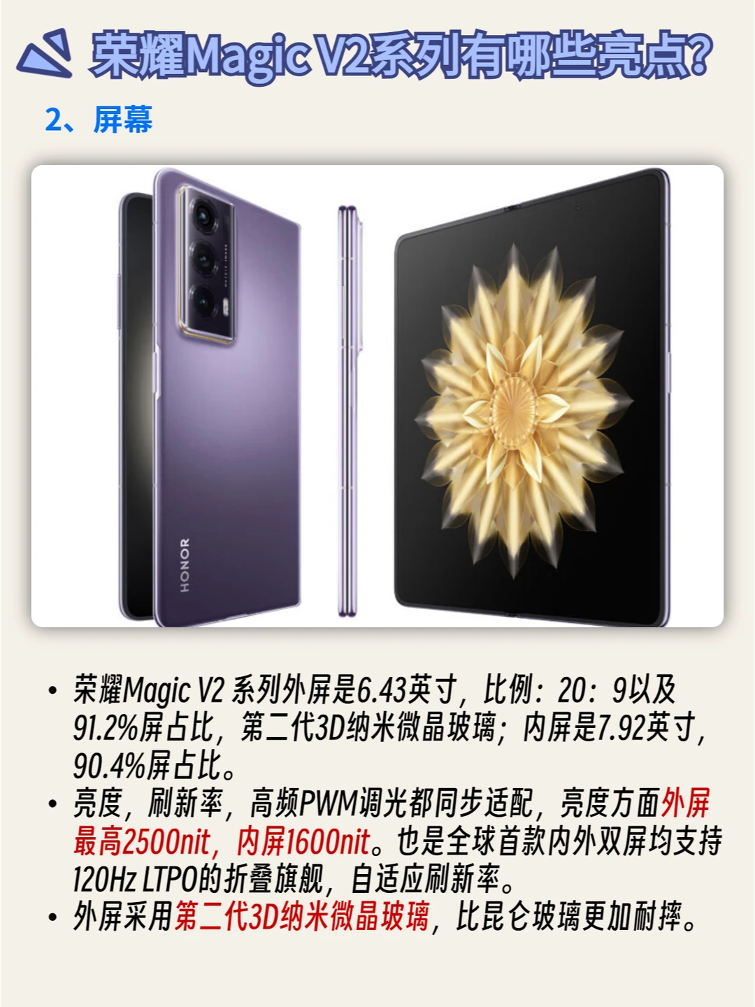 荣耀Magic V2 系列外屏是6.43英寸,比例:20:9以及91.2%屏占比,第二代3D纳米微晶玻璃;内屏是7.92英寸,90.4%屏占比。