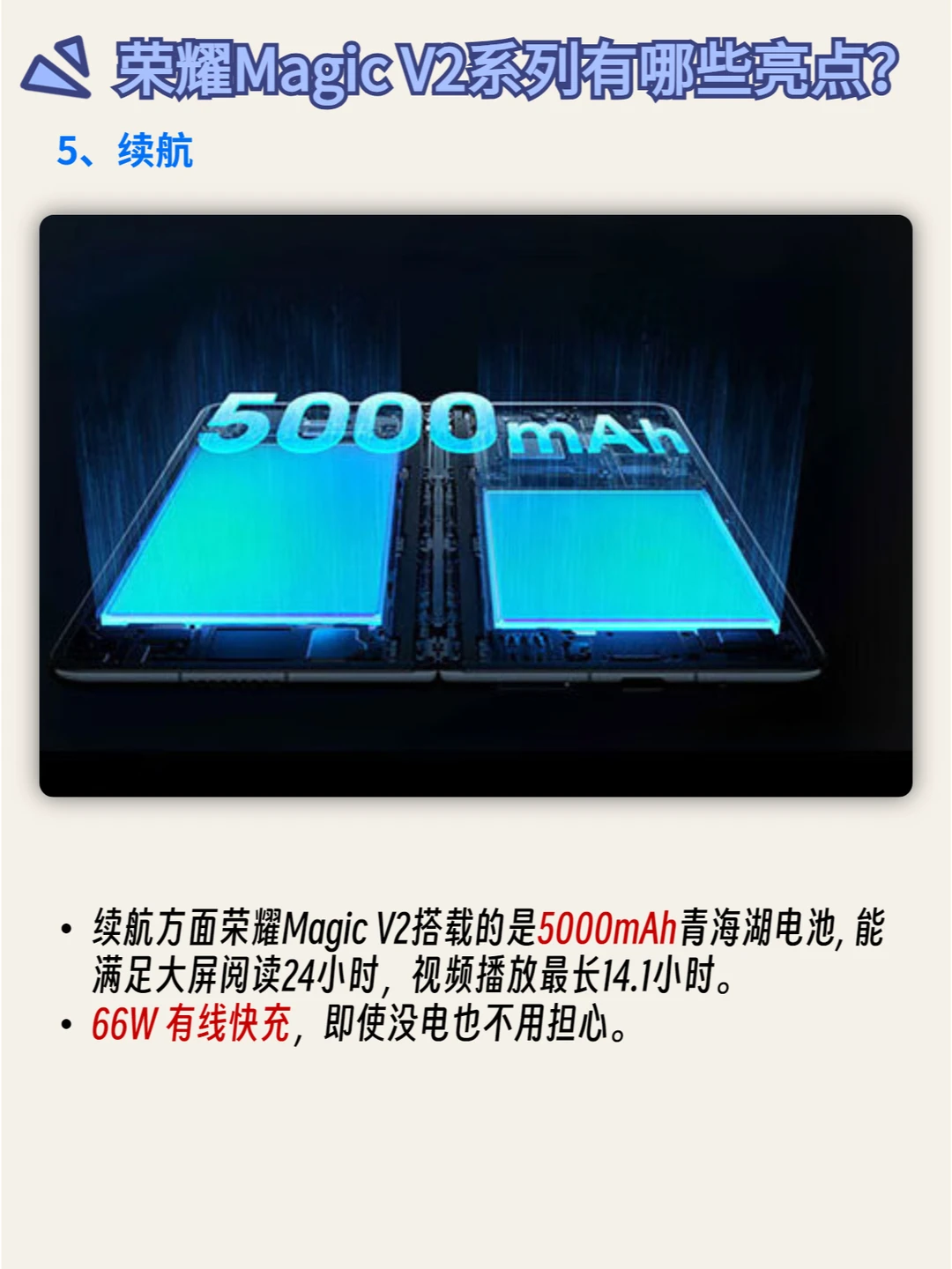 续航方面荣耀Magic V2搭载的是5000mAh青海湖电池, 能满足大屏阅读24小时,视频播放最长14.1小时。