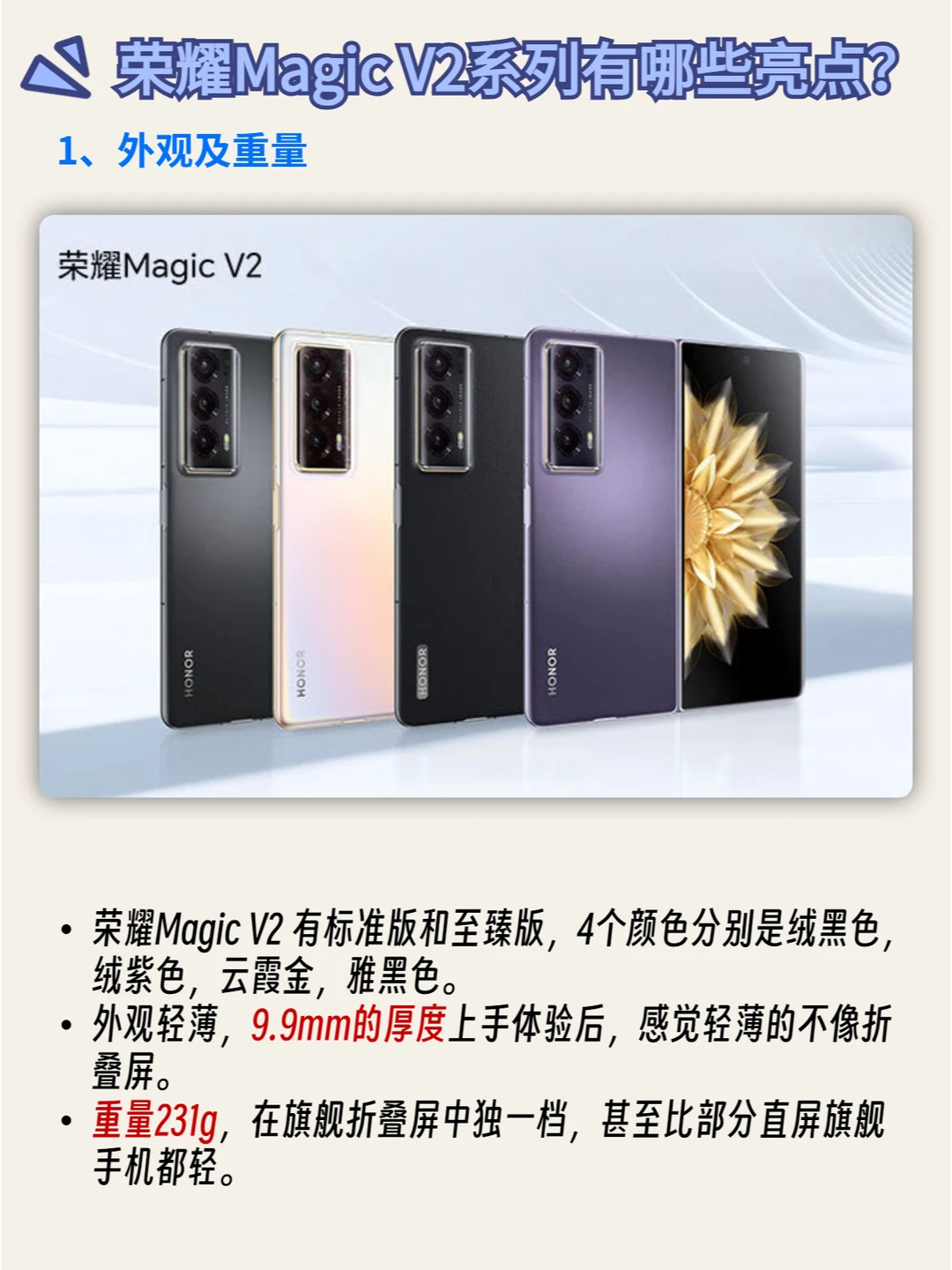 荣耀Magic V2 有标准版和至臻版,外观轻薄,9.9mm的厚度上手体验后,感觉轻薄的不像折叠屏。重量231g,在旗舰折叠屏中独一档,甚至比部分直屏旗舰手机都轻。