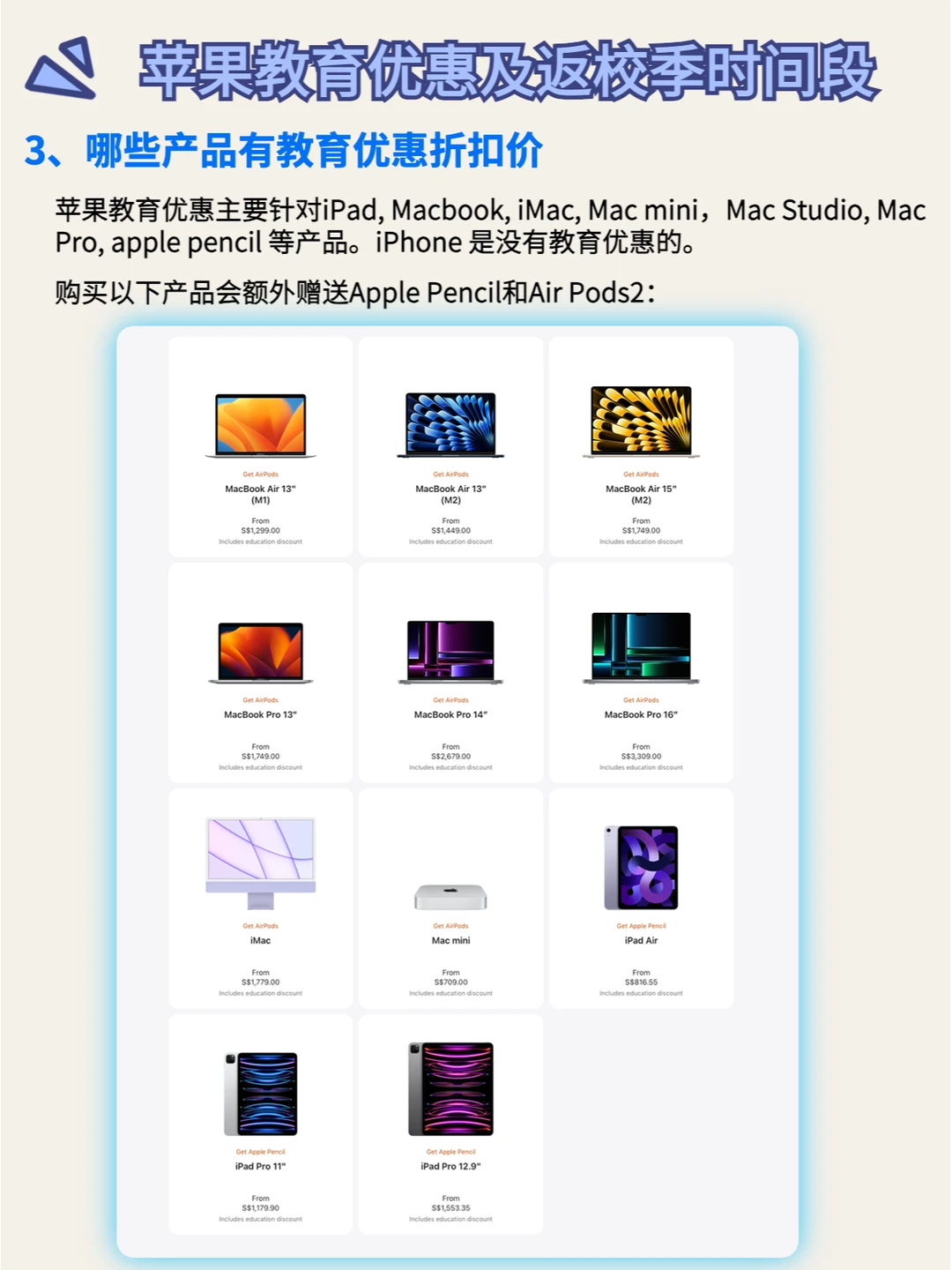 苹果教育优惠主要针对iPad, Macbook, iMac, Mac mini,Mac Studio, Mac Pro, apple pencil 等产品。iPhone 是没有教育优惠的,具体哪些产品会额外有赠品,详细看图4。