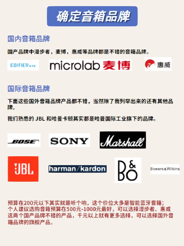国外:BOSE、SONY、马歇尔、JBL、哈曼卡顿、B&O、B&W