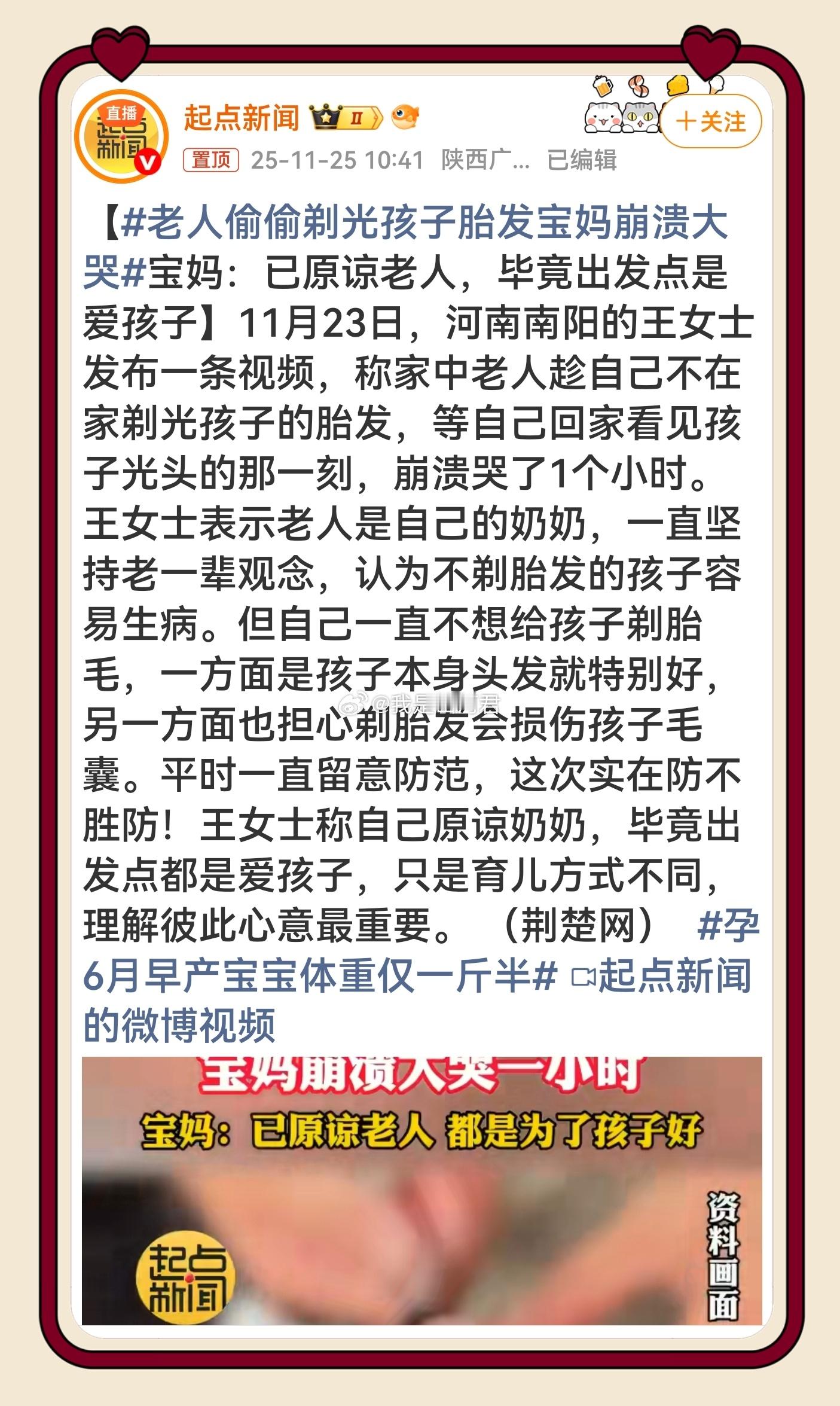 这位奶奶的爱太“硬核”了,宝妈崩溃大哭真的太能理解了!宝宝头发好好的,突然被剃光,既心疼娃的毛囊可能受影响,又有种自己的想法被忽视的委屈。不过老人也是抱着老观念想为孩子好,隔代育儿的观念差,说到底还是需要多沟通,这份爱倒是真真切切的❤️