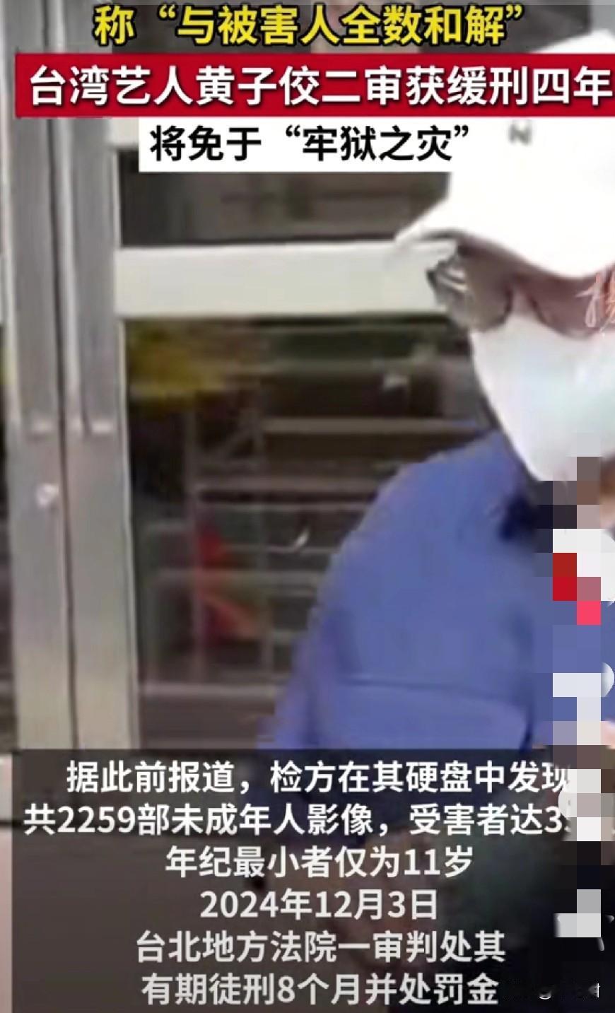 湾湾省的黄子佼二审下来了,判一年4个月,但是缓刑4年,这算是逃避了牢狱之灾吗? 在二审下来之前,他已经全部和受害者达成了和解。这起事件的起因是黄子佼性骚扰未成年少女,引起的指控。 在调查的后续中,警方意外在他家里搜到二千余部影片,有一部分是他购买的未成年不雅影片,还有一部分就恐怖了,居然是他自拍的,有35名受害者女孩,均是未成年人。 实在难以想象一个还算有点名气的艺人,居然做出这样的事情,老婆本来就比他小20岁,还不满足。 甚至当初还是他抛弃了小S和曾宝仪,让她俩整整恨了对方很多年,不知道面对这样一个人,会不会悔不当初瞎了眼,居然看上同一个。 好在现在各自都有了不一样的人生,可惜黄子佼的妻女却无辜受连累,和一个有恋童癖的人有交集,实在让人大跌眼镜啊。 这最后的审判结果,也算是他花钱买了自由啊,缓刑4年却让30多名小女孩,背上了一辈子的童年阴影了。 (图片来自网络视频)