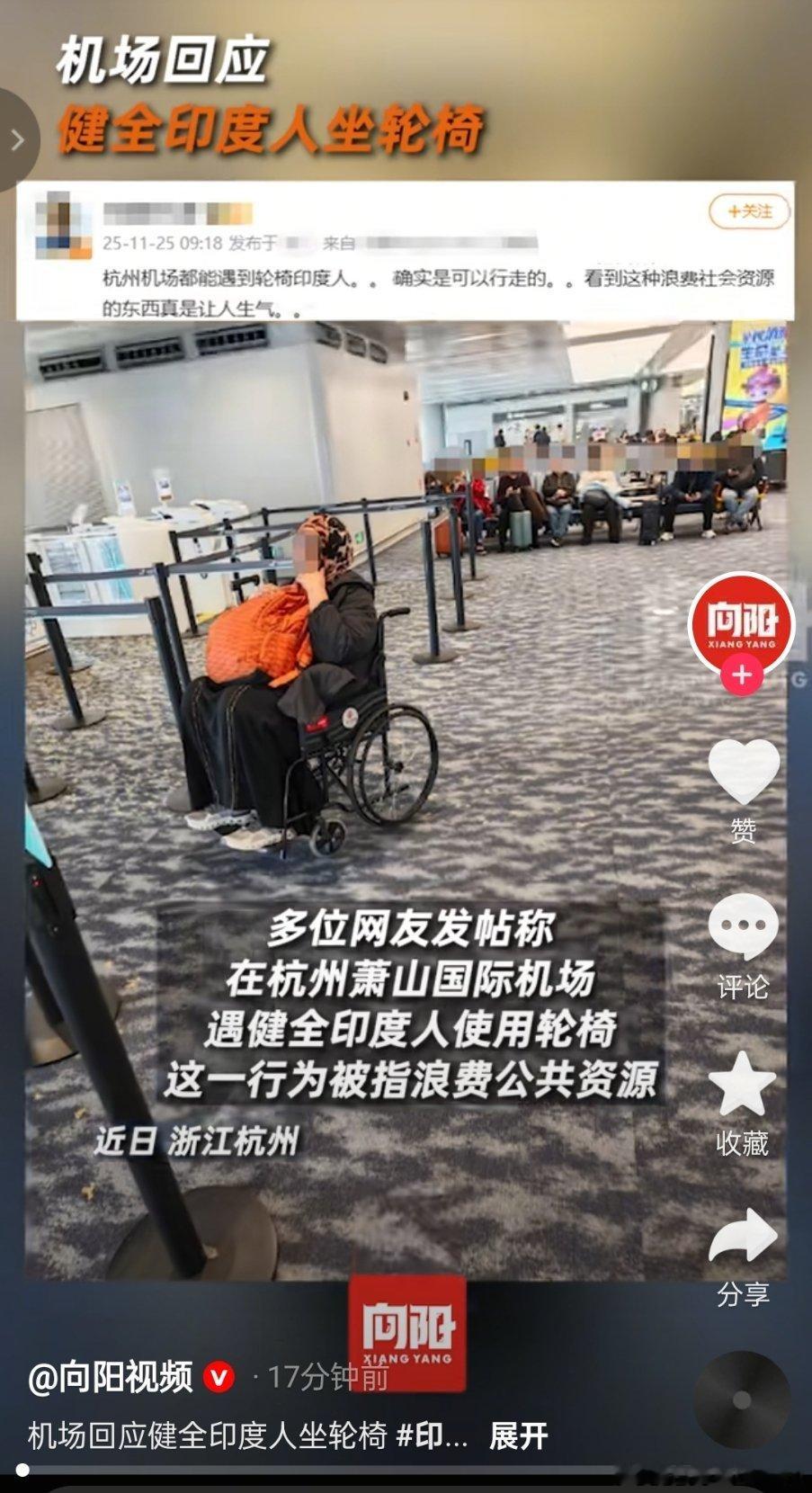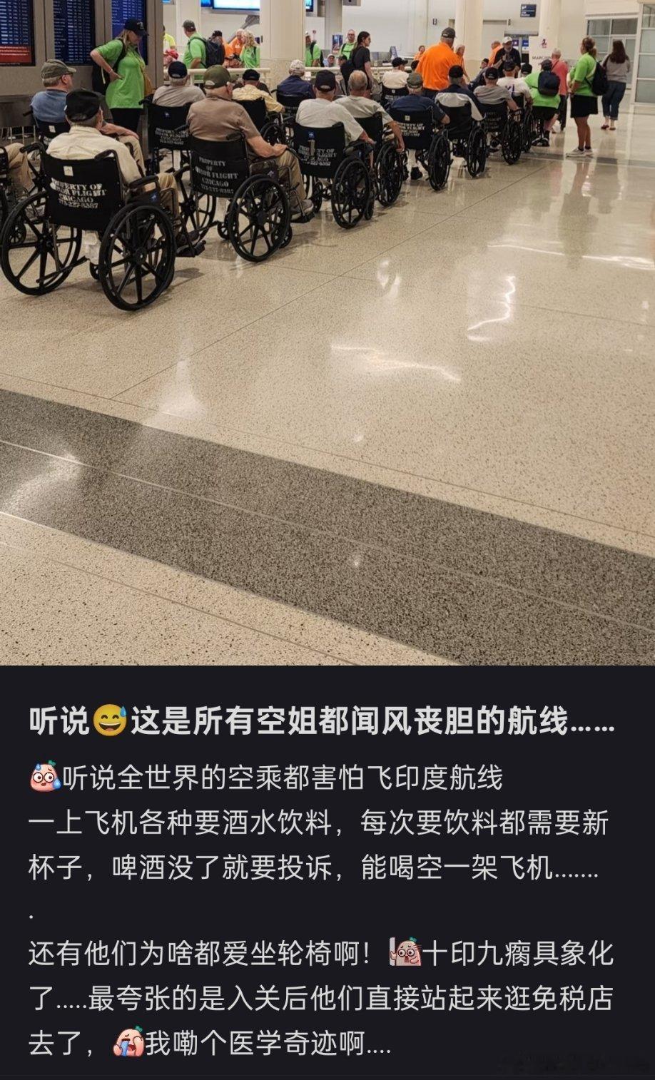 印度人爱坐轮椅的习惯令全世界空姐都闻风丧胆,只要轮椅服务是免费的,印度人就会占便宜,国外有时候一个印度航班能看到五十多个印度人的轮椅。有网友说看到印度人在杭州机场使用轮椅服务,我一点都不会觉得奇怪。