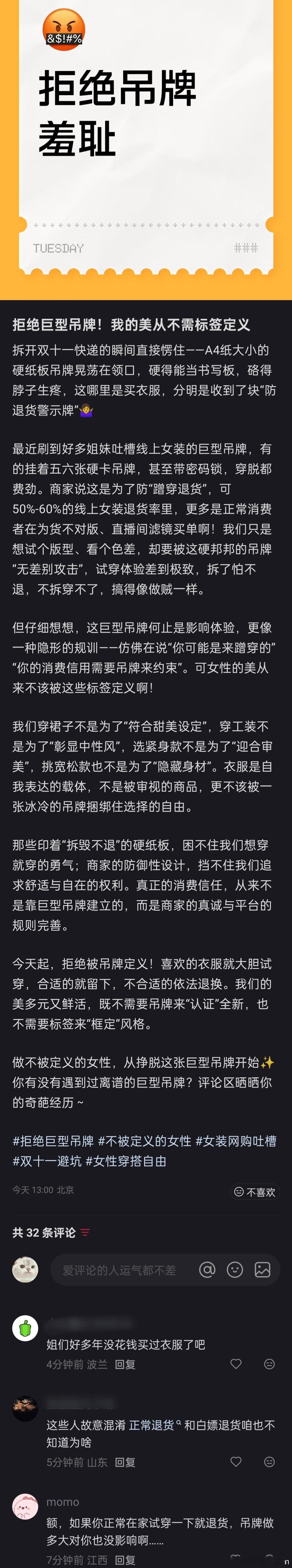 网友:拒绝吊牌羞耻!拒绝巨型吊牌!