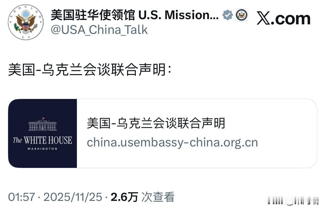 白宫发布美国-乌克兰会谈联合声明,内容如下: 2025年11月23日,美国和乌