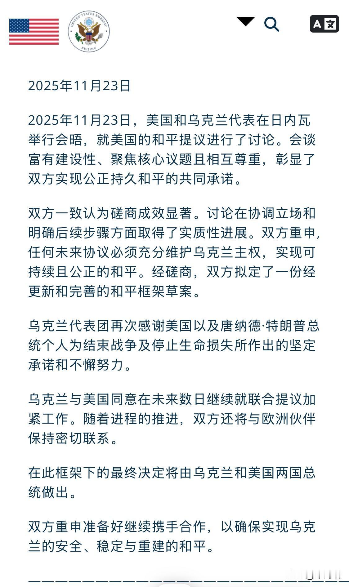 白宫发布美国-乌克兰会谈联合声明,内容如下: 2025年11月23日,美国和乌克兰代表在日内瓦举行会晤,就美国的和平提议进行了讨论。会谈富有建设性、聚焦核心议题且相互尊重,彰显了双方实现公正持久和平的共同承诺。 双方一致认为磋商成效显著。讨论在协调立场和明确后续步骤方面取得了实质性进展。双方重申, 任何未来协议必须充分维护乌克兰主权,实现可持续且公正的和平。经磋商,双方拟定了一份经更新和完善的和平框架草案。 乌克兰代表团再次感谢美国以及唐纳德·特朗普总统个人为结束战争及停止生命损失所作出的坚定承诺和不懈努力。 乌克兰与美国同意在未来数日继续就联合提议加紧工作。随着进程的推进,双方还将与欧洲伙伴保持密切联系。 在此框架下的最终决定将由乌克兰和美国两国总统做出。 双方重申准备好继续携手合作,以确保实现乌克兰的安全、稳定与重建的和平。