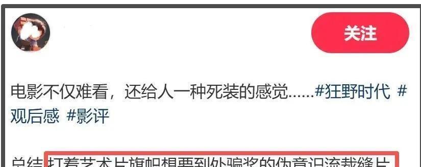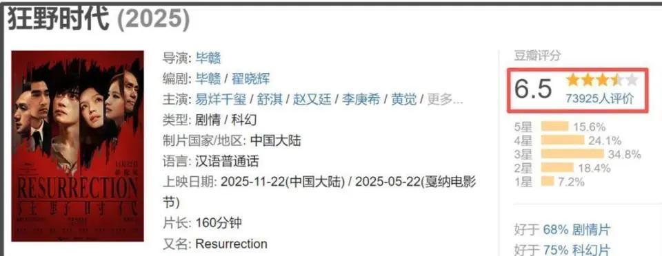 易烊千玺新片《狂野时代》的退票率引发大量关注。猫眼专业版数据显示,11月22日上映首日,退票率为14.8%,超15万人次退票;次日退票率10.9%,约3.96万人退票。 这部电影口碑两极分化严重,有人“看睡着了”“看不懂”,也有人觉得是“写给电影的满分情书”。目前豆瓣6.5分,超8.88万人评分,三星评价最多,占比34.8%。网络大V罗永浩强烈推荐,让大家尽情享受能感受的部分。它由毕赣执导,易烊千玺、舒淇主演,以六感对应六个章节,不知你会给它打几分?