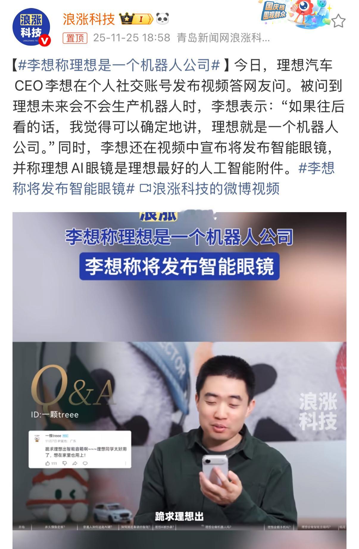 李想在访谈中称理想是一个机器人公司,我觉得是完全没有问题的。李想造车,也是把车当作一个机器人来做。机器人的概念是什么呢?不仅仅只是听从指令服从指令,更多的是有自己思考的能力。所以我们可以在理想VLA司机大模型中看到理想的重点,重点就是可以不断的学习、不断的进步,直到有自己独立分析导航的能力。 智能眼镜,其实就是一个微型机器人,所以理想智能眼镜来了。所有的AI公司,一定需要有自己的硬件产品作为自己业务的出口,智能眼镜就是一个出口。我前阵子去理想北京总部体验过理想的智能眼镜,怎么形容呢?爱不释手。接下来我觉得我们得静待理想的智能眼镜产品了。