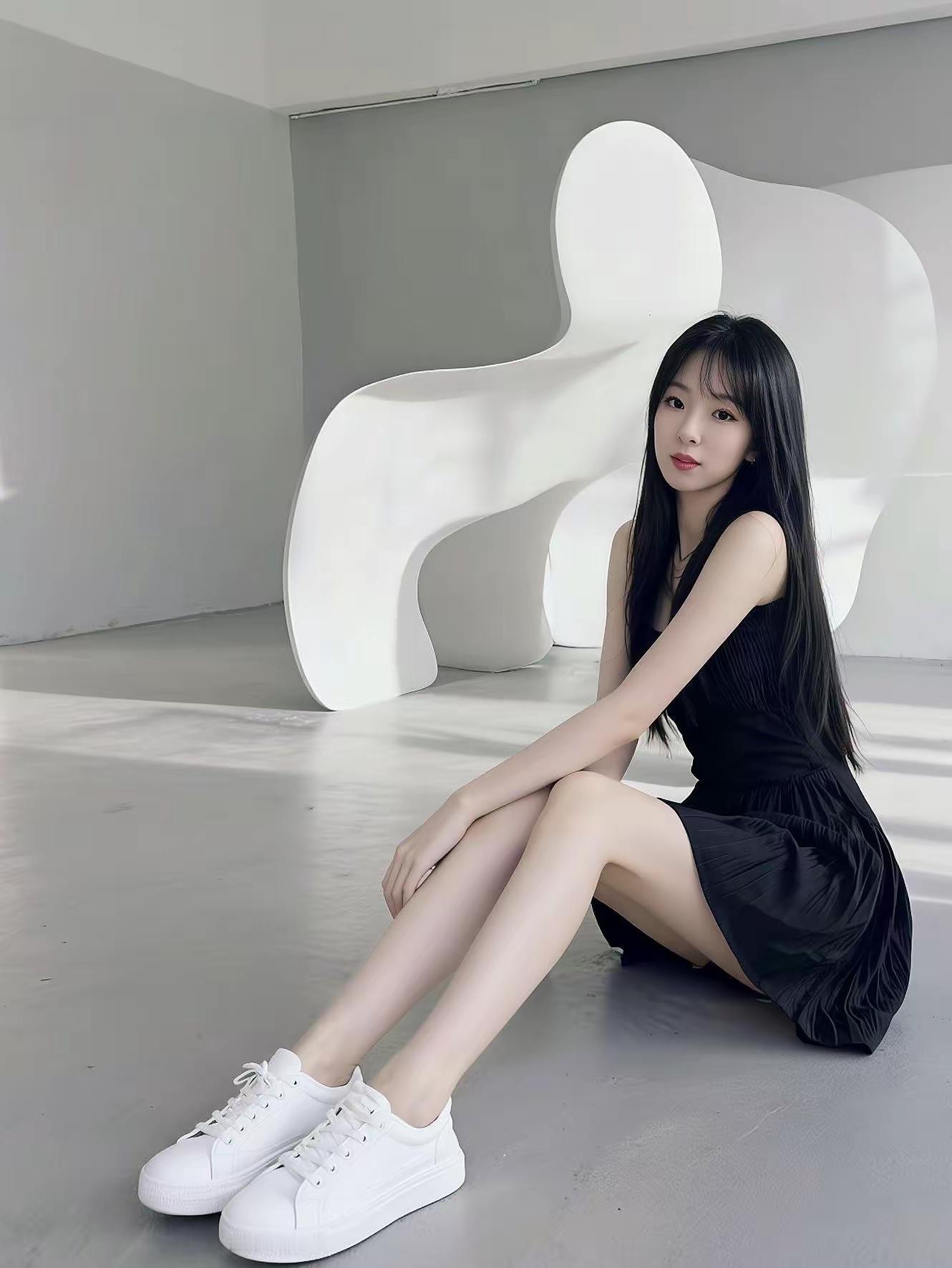 简约黑白穿搭,时尚少女坐于现代艺术装置前。你见过最好看的女孩背影是什么样的 一张照片记录今日份美好