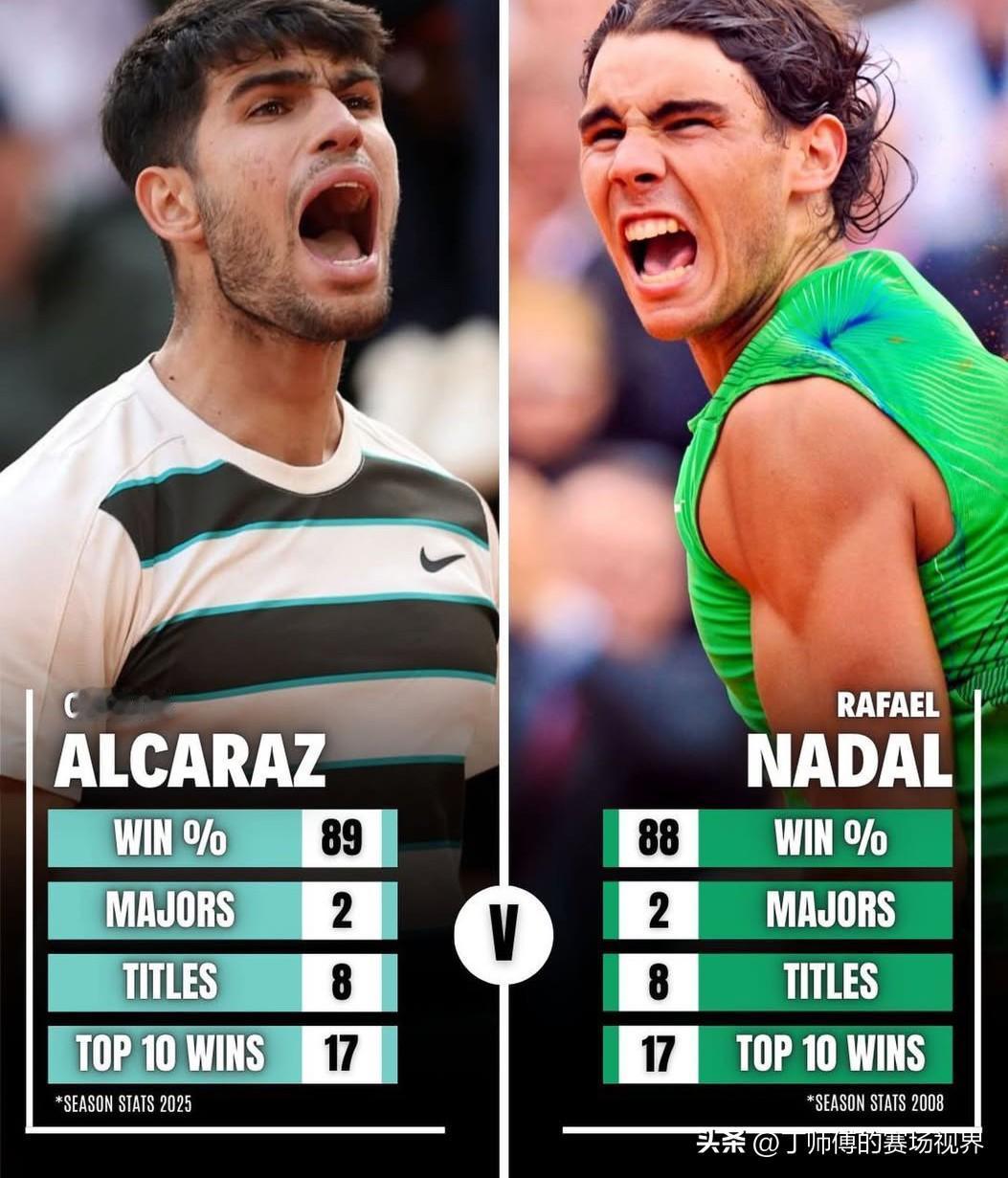 年仅22岁的阿尔卡拉斯打出了一个几乎与纳达尔在2008年同龄时的传奇赛季: 胜率:阿尔卡拉斯89%,纳达尔88% 大满贯:阿尔卡拉斯2个,纳达尔2个 冠军头衔:阿尔卡拉斯8个,纳达尔8个 对前十球手胜场:阿尔卡拉斯17场,纳达尔17场 不得不说西班牙真的出天才,纳达尔早在2008年就已经有这种统治力,要知道那时候还是巅峰费德勒的天下。值得一提的是,纳达尔通过澳网冠军开启了2009赛季,所以真正的问题是,阿尔卡拉斯能否在短短两个月后以同样的方式开启2026年?