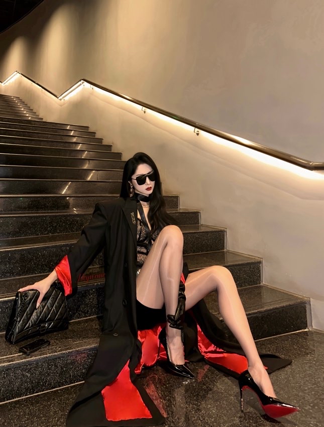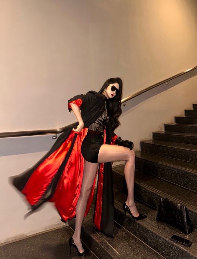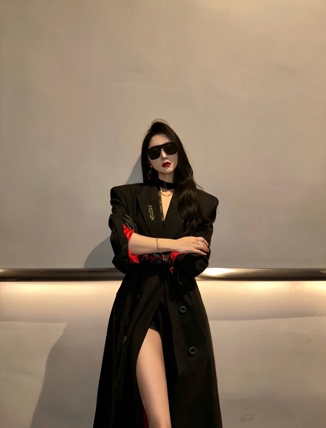 都市女郎的时尚穿搭,黑色西装搭配红色丝绒裙,尽显优雅与自信!