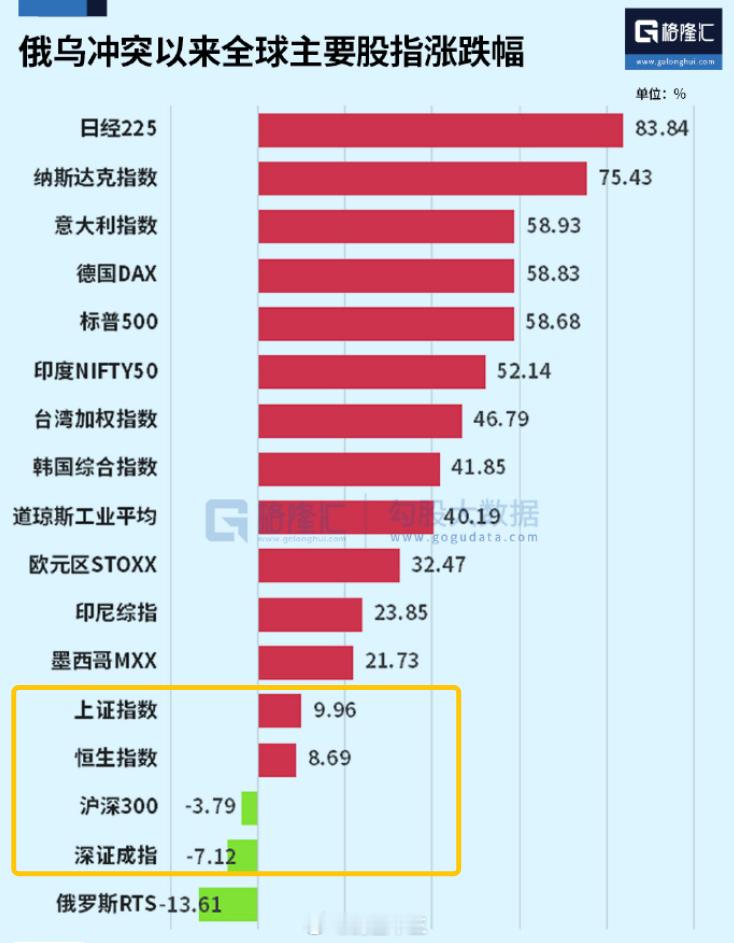 22年俄乌战争以来全球主要股指涨跌幅 这说明什么?A股在26年3月后还有很大上涨空间
