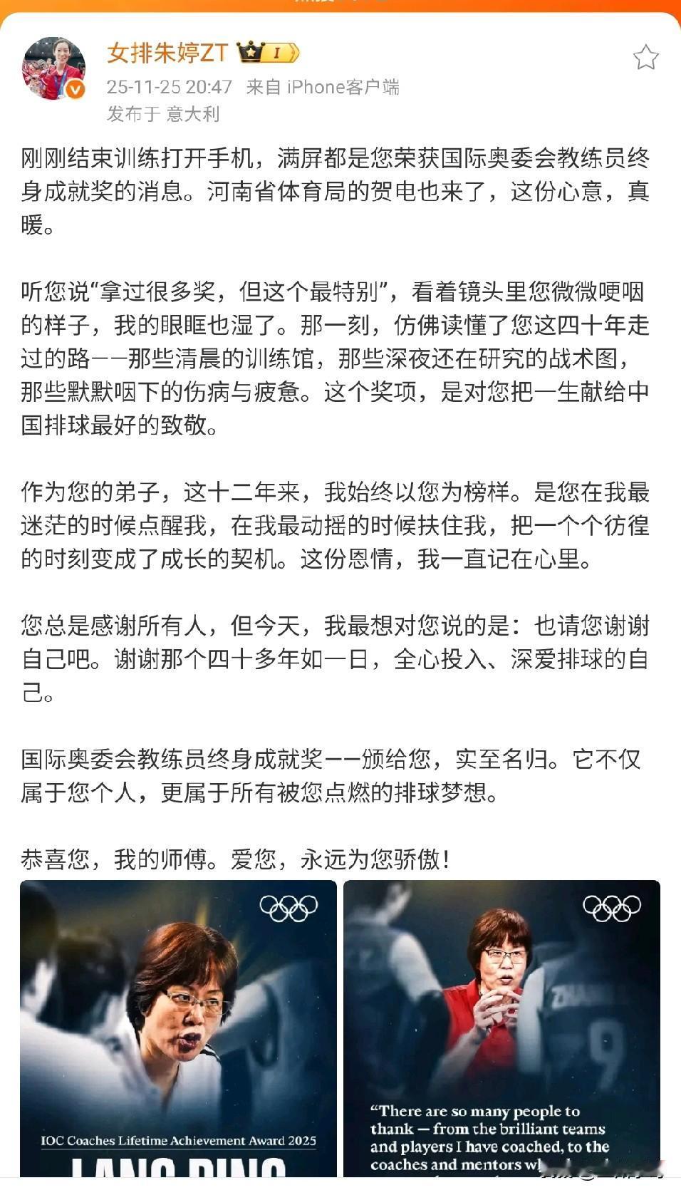 【恭喜您,我的师傅。爱您,永远为您骄傲!】朱婷 远在意大利的明星主攻朱婷在获知