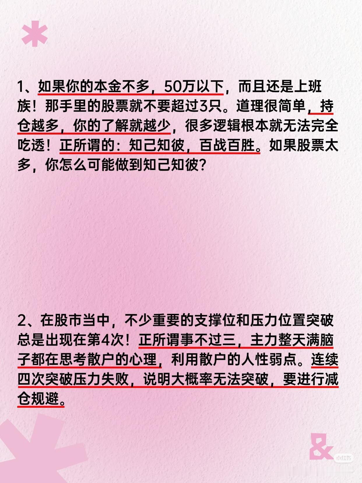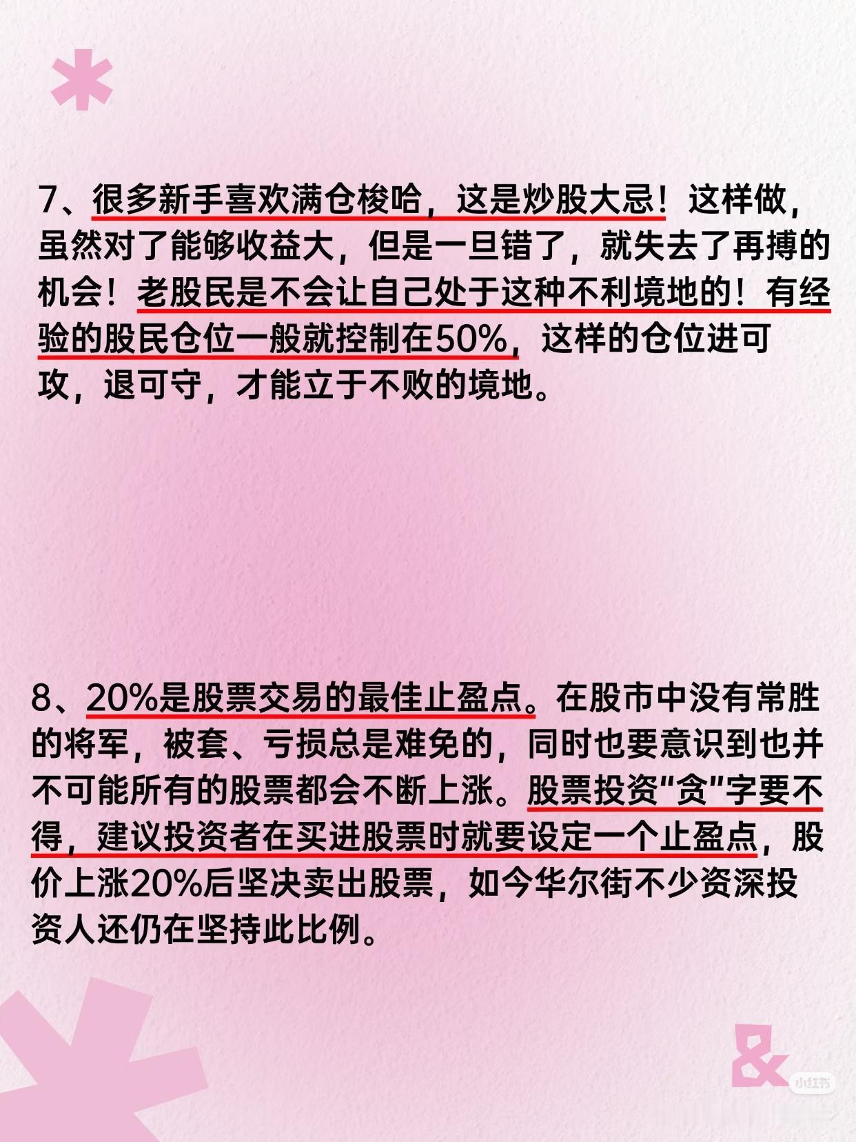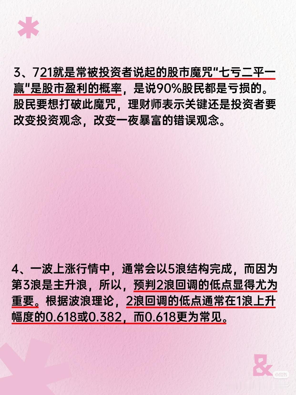 “从20万炒股炒到200万的笨方法”,称其简单却能实现稳定获利,并引出需牢记的几点关键内容。 具体建议包括: 1. 针对本金50万以下的上班族,建议持仓不超过3只股票。因持仓越多,对个股的了解越浅,难以吃透逻辑,无法做到“知己知彼”,影响投资效果。 2. 股市中重要支撑位和压力位的突破常出现在第4次,主力会利用散户心理,若连续四次突破压力失败,大概率无法突破,需减仓规避。 3. 解释“七亏二平一赢”的股市魔咒(即90%股民亏损),指出打破魔咒的关键是改变“一夜暴富”等错误投资观念。 4. 基于波浪理论,一波上涨行情通常以5浪结构完成,第3浪是主升浪,因此预判2浪回调低点至关重要。该低点一般在1浪上升幅度的0.618或0.382处,0.618更常见。 5. 个股跌幅超70%后多进入超跌范围,若无财务造假等恶性情况,当股价向上冒头且成交量放大时,往往有资金抄底。 6. 以跌幅超60%作为低价股的判断比例,此类个股可视为低价圈;若股价涨幅、量比靠前,说明主力有拉高意图,此时参与风险较小。 7. 新手满仓炒股是大忌,虽可能短期高收益,但一旦失误便失去补救机会;有经验的股民会将仓位控制在50%,保持“进可攻、退可守”的灵活性。 8. 20%是股票交易的最佳止盈点,投资者需避免贪婪,买入时设定止盈目标,股价上涨20%后应果断卖出,这一策略也被华尔街不少资深投资人沿用。
