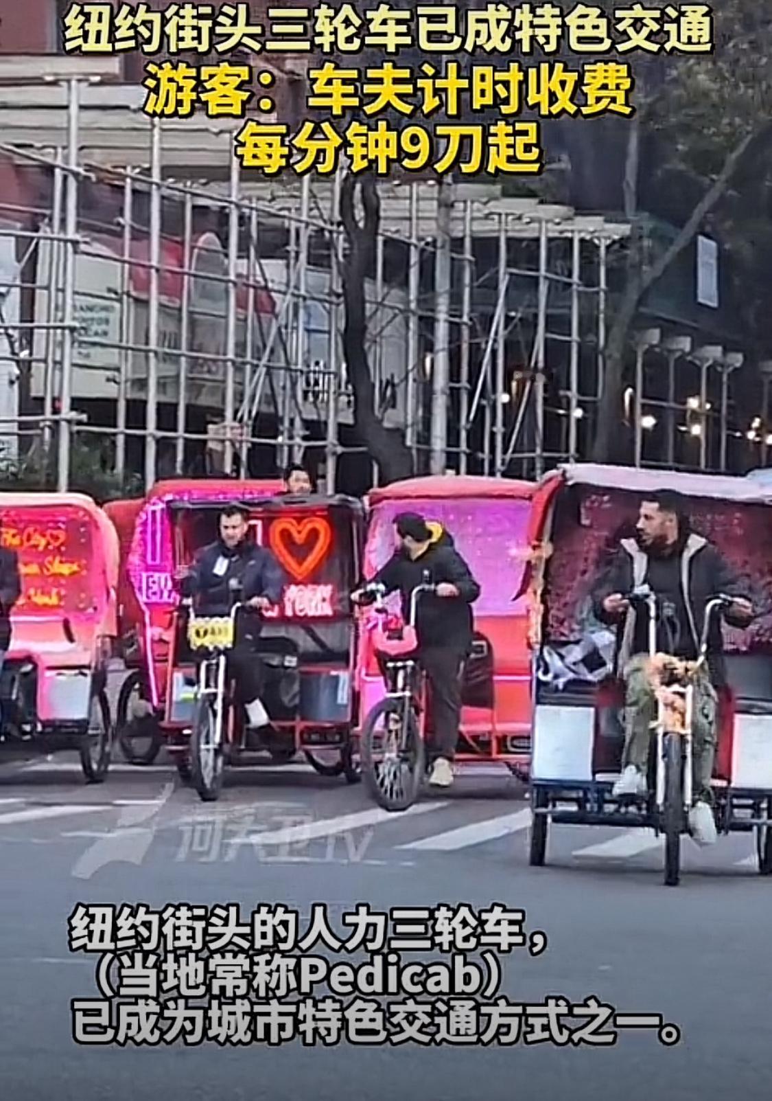 人力三轮车抢占纽约市场! 纽约街头,装饰得红红绿绿的三轮车十分抢眼,没错就是我们这边蹬的那种三轮车,只不过车夫换成洋人了,他们靠拉游客谋生。 不过他们赚得比我们狠多了,计时收费,每分钟9美元,每天入账近千美元,妥妥的高收入群体。 这行当可以啊,谁有门路,混不下去了可以去那边蹬三轮!