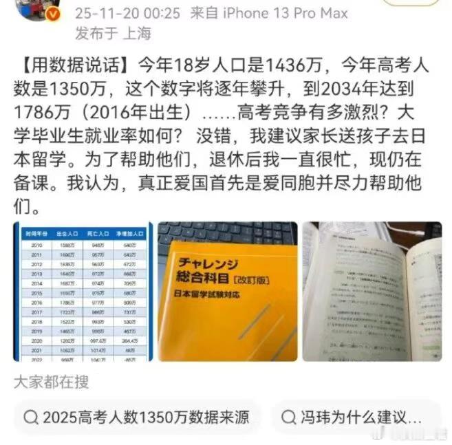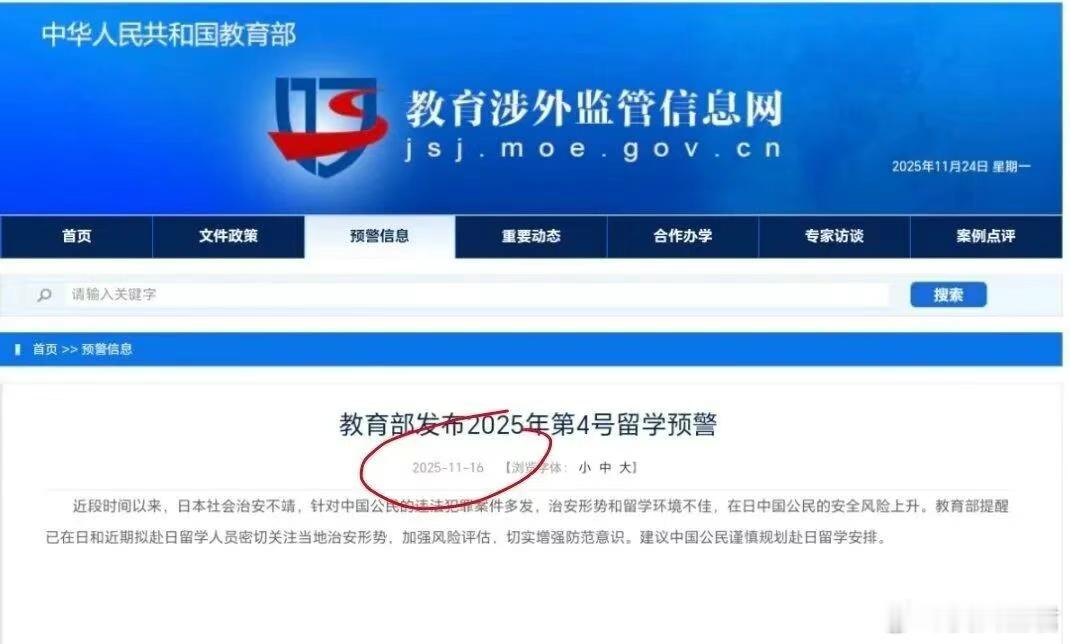 大学教授无视国家预警,要中国人把孩子送到日本留学,称是真爱国11月7日,日本首相高市早苗公然以所谓的“存亡危机事态”为理由,叫嚣武力介入台海。日本新任首相如此狂妄的走军国主义的邪路,还如此赤裸裸地讲出向中国开战的话,自然遭到中国迎头痛击。11月14日,外交部领事司发布消息提醒中国公民近期避免前往日本。11月16日,文化和旅游部发布消息提醒中国游客近期避免前往日本旅游,教育部发布留学预警,建议中国公民谨慎规划赴日留学安排。关于中国游客近期避免前往日本旅游的建议,发布次日那个前全国人大代表、知名的律师就专门从哈尔滨飞到日本,说“不轻信权威”。有意思的是,我截这个律师在社交媒体上发的一系列内容的屏发到公号上,却不到24小时就被灭了。同样,在教育部发布中国人赴日留学预警之后,有个广大网民非常非常熟悉的大学教育,在11月20日专门在社交媒体上发帖,呼吁、建议中国家长把孩子送到日本留学,还说这才是“真正爱国”。为了文章能活下来,也只好把这个教授的网名给截掉了。对了,就是这个教授,在网络上公然称他的祖父是“抗日分子”。众所周知,所谓的“抗日分子”那可是日本军国主义、侵华日军说的话。所以,立场就非常明白了吧!国家建议近日避免前往日本旅游,他们立即飞到日本,每天发多个帖子说“不轻信权威”;国家发布留学预警建议中国公民谨慎规划赴日留学安排,他们立即跳出来建议中国家长把孩子送到日本留学,还扬言这才是“真正爱国”。只能说,这个世界真疯狂。