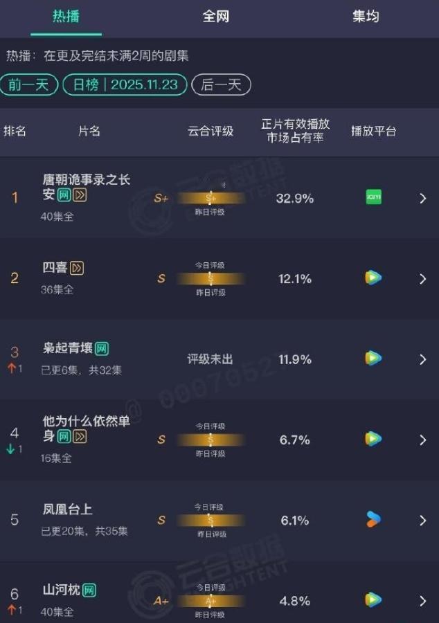 《枭起青壤》第二天的云合走势非常好 从第一天的6.7%到了第二天的11.9%,几乎要翻倍了,日播放量涨到了2100万左右,看目前的走势,最终集均2500万到3000万应左右,其实尾鱼这几部小说改编的剧都挺好看的,只是播的不算好,就爆了景甜的《司藤》,还是因为旗袍造型出圈的。