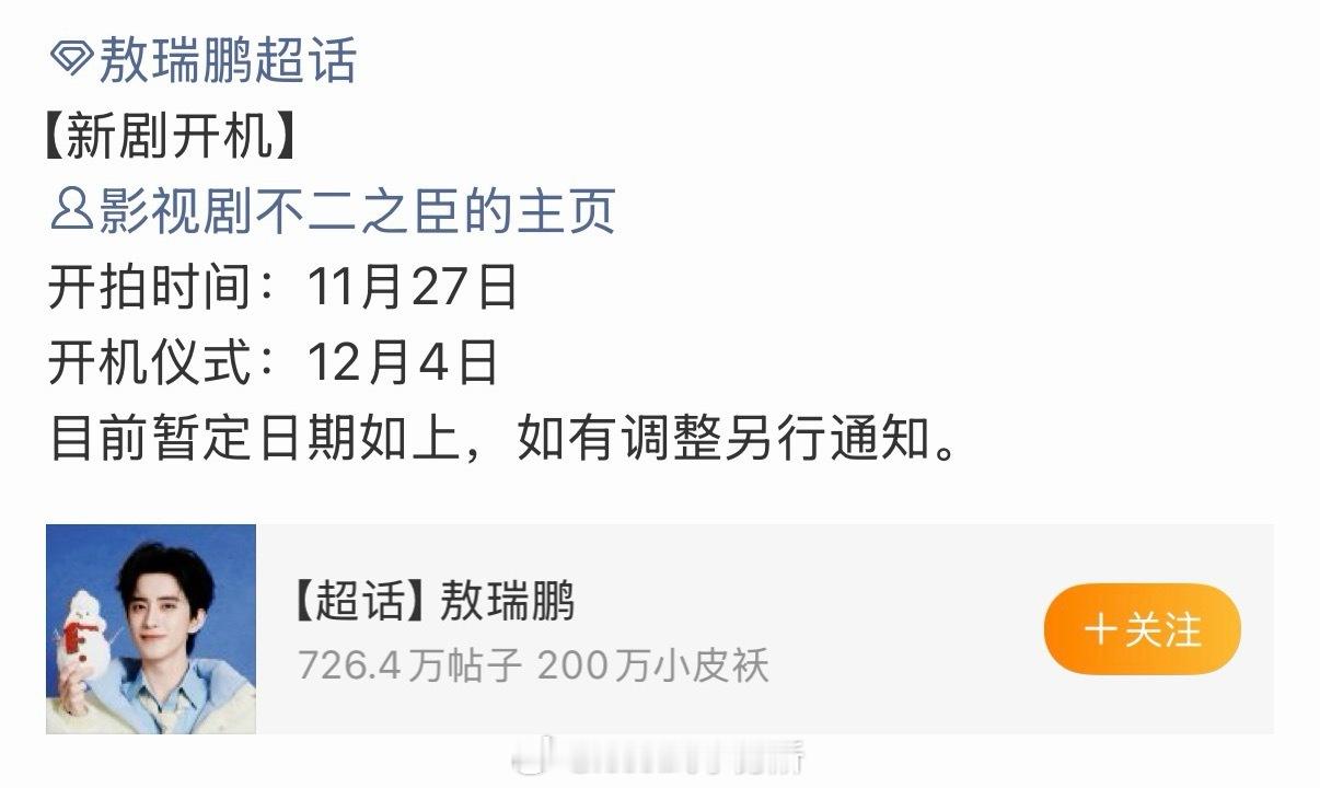 敖瑞鹏《不二之臣》开拍时间11月27日,开机仪式12月4日,岑森终于要来了