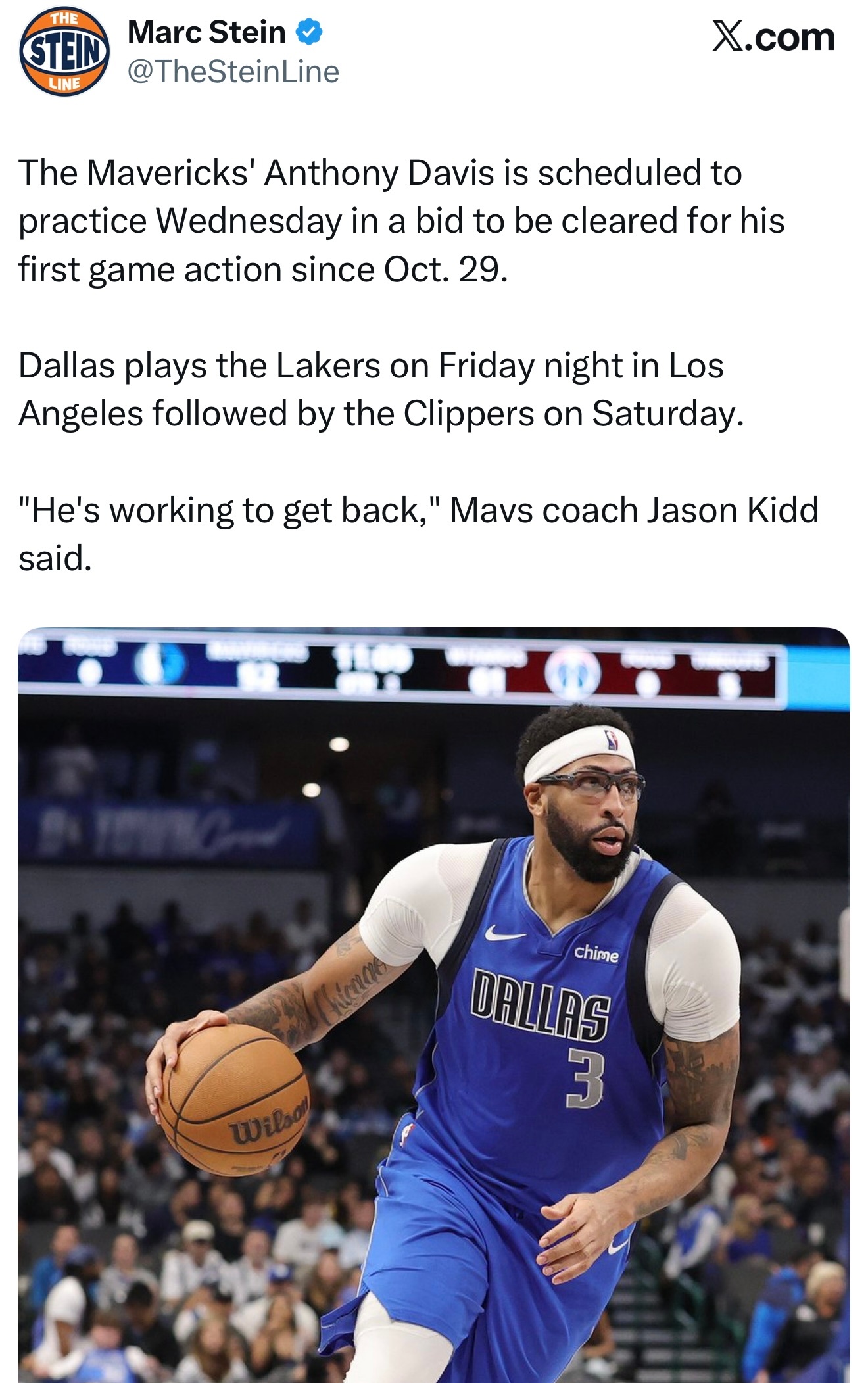 Marc Stein:安东尼·戴维斯计划于周三参加球队训练,若通过评估将获得出场许可,这将是其自10月29日以来首次重返赛场。达拉斯独行侠将于周五晚在洛杉矶客场挑战湖人队,次日背靠背迎战快船队。独行侠主帅基德表示:“他正在为复出积极准备。”