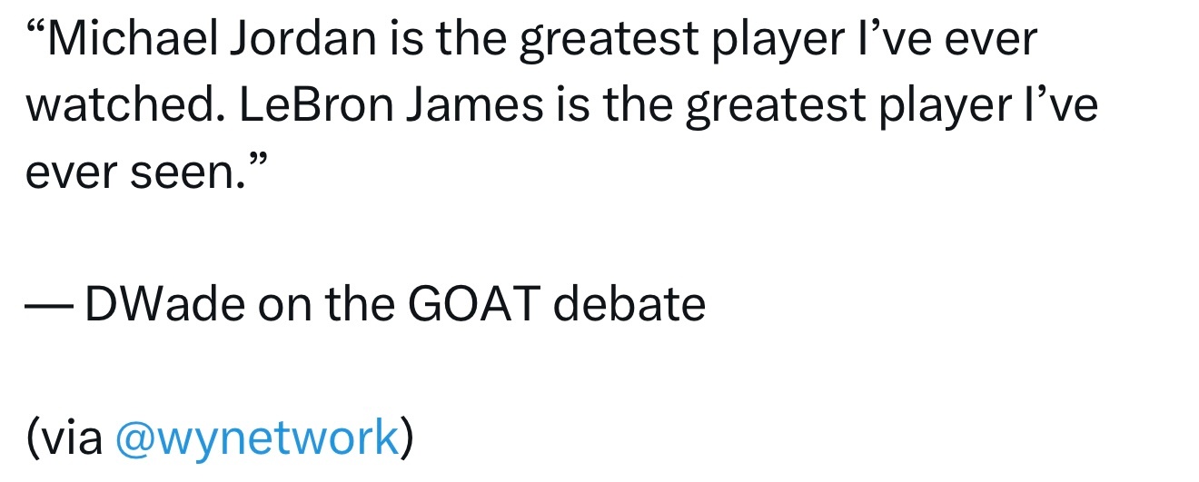 韦德谈历史最佳球员之争:“在我看过(电视上)的球员中,迈克尔·乔丹是最伟大的。在我亲眼见识过的球员中,勒布朗·詹姆斯是最伟大的。”