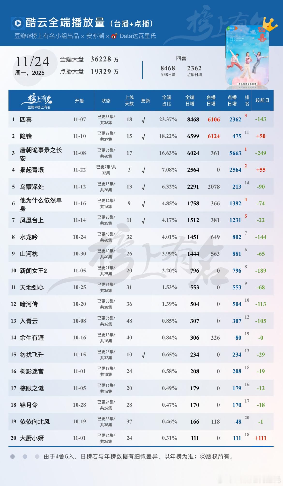 11.24酷云播放量,周一普降🌴豆瓣榜上有名小组 全端日冠×17 点播端5663降249 第3日2564 1392 点播端1231 802 881