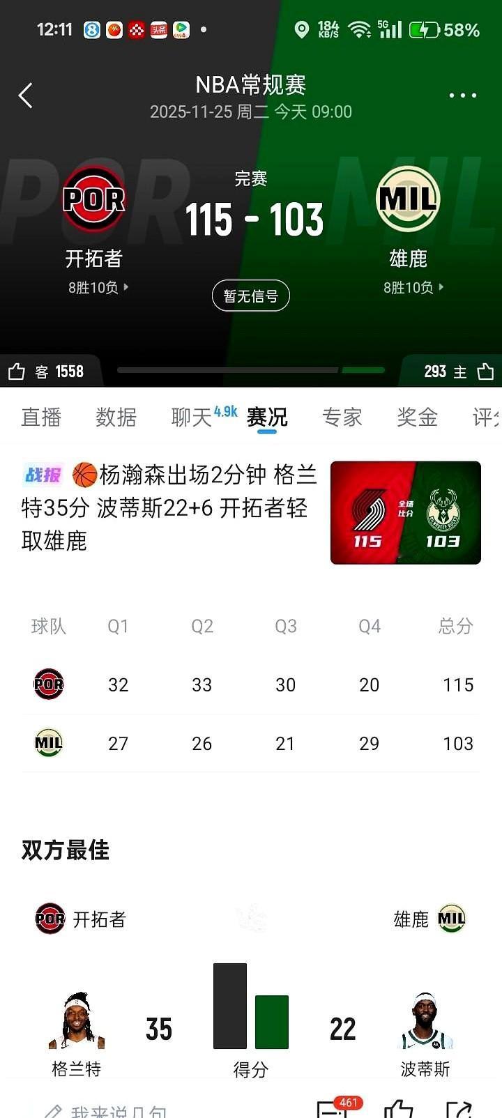 杨瀚森只打了4分钟,雄鹿就被干懵了。 开拓者那边简直打疯了。阿芙迪亚和格兰特就他俩,联手扔进8个三分,合砍48分,直接把雄鹿防线给射穿了。内线更别提,被开拓者中锋克林根一个人拿捏,狂抢15个篮板,其中6个还是前场篮板,这比赛还咋打嘛。 反观雄鹿自己,打得那叫一个挣扎。波蒂斯这些球员过度依赖外线投射,全队三分命中率才32%,人家开拓者可是远超赛季平均的41%。内线守不住,外线投不进,第三节分差就奔着30分去了,比赛早就花了。 最让球迷上火的还是杨瀚森。就给了4分钟,真就4分钟,板凳还没坐热呢。社交媒体上都吵翻天了,都在质疑教练的用人。专家也觉得,球队都这样了,应该多给年轻人机会。 现在好了,一波三连败直接掉到东部第六。开拓者倒是拿了个赛季首个三连胜。雄鹿教练组压力估计山大,再不调整阵容就真麻烦了。