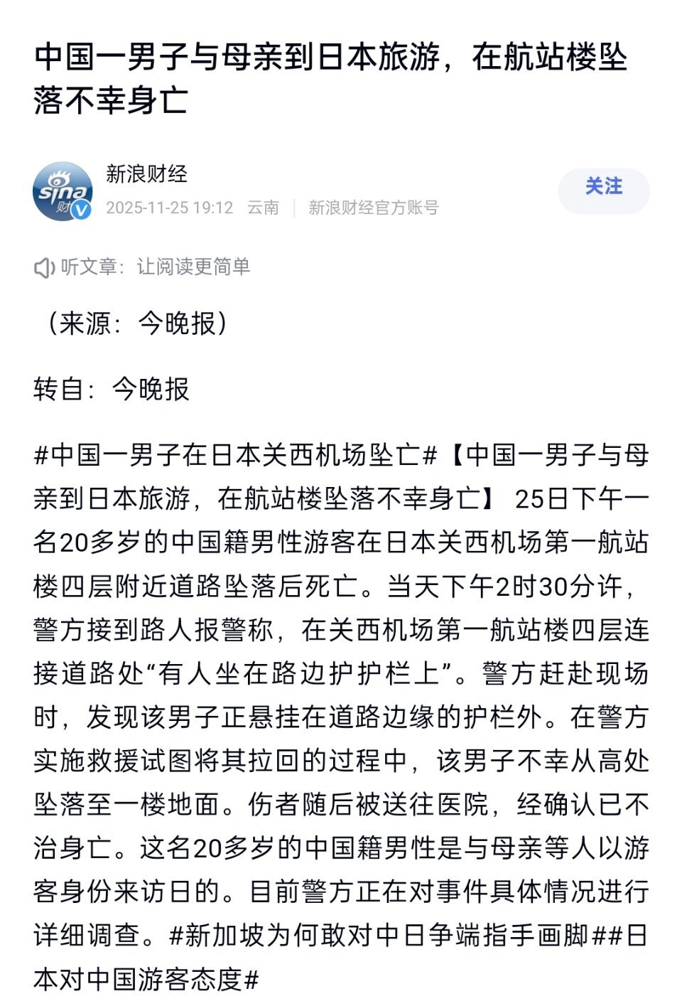 啊?日本关西机场坠亡男子是中国游客。这名中国男子与母亲到日本旅游,在日本关西机场航站楼坠落不幸身亡。啥情况这是?