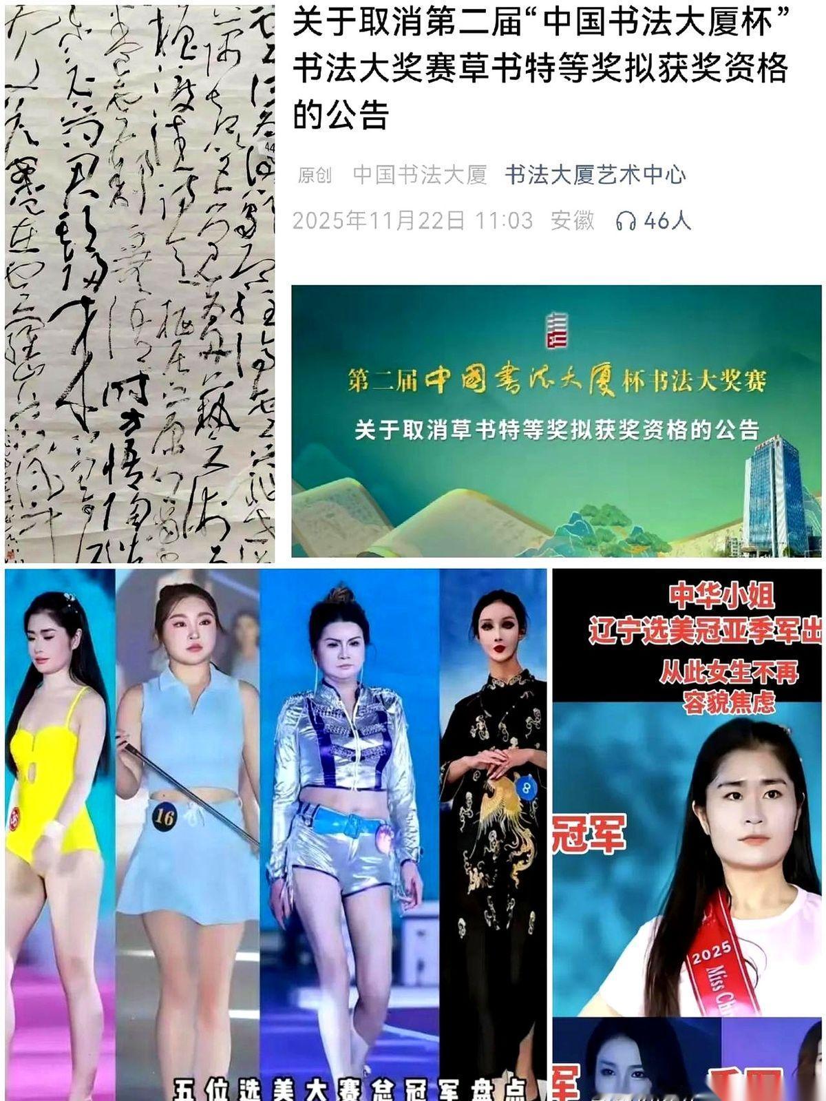 50万,差点就给了一幅据说小学生都写得比它好的“草书”。 真的,没开玩笑。 要不是网友们炸了锅,这50万奖金加“书法大师”的帽子,人家就真揣兜里了。评委亲自下场“改卷”,这操作骚不骚? 你以为这就完了? 不,这只是开胃小菜。 那边书法界刚演完,这边模特圈又开大戏。 广东的模特冠军,是个大妈,身高据说不到一米六,肚子上的肉肉比她的台步还有节奏感。 还有辽宁的选美冠军,一张方正的国字脸,主办方管这叫“打破审美偏见”。 陕西的冠军,胖胖的,他们说这叫“圆润美”。 我真的会笑。 大哥,别闹了行吗? 你跟我扯什么多元化审美呢?咱们普通老百姓,可能不懂艺术,可能不懂时尚,但我们不瞎啊。 什么是真本事,什么是硬凑的,什么是背后有“故事”的,我们心里门儿清。 最恶心人的不是他们拿了奖,是他们拿了奖之后,还要指着我们的鼻子,硬说我们审美有问题。 把黑的说成白的,把指鹿为马当成审美创新。 别拿“多元”当幌子了,真没意思。 也别把观众当傻子。 我们只是懒得说,不代表我们真信了。