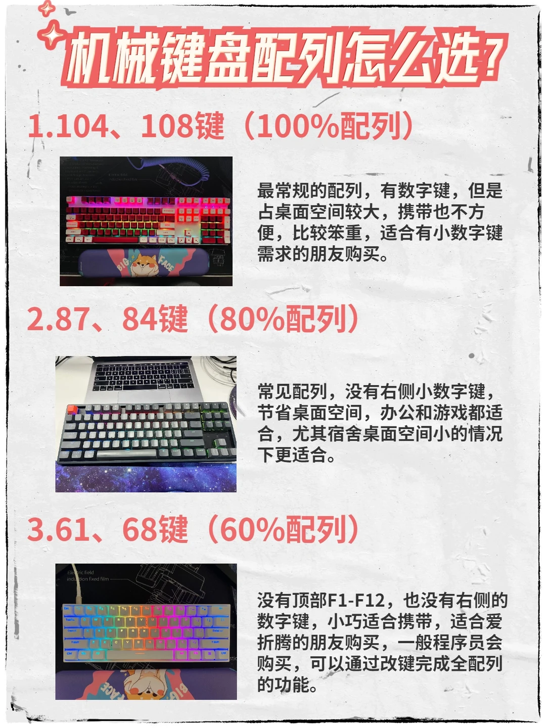 需要小数字键买104键,桌面拥挤不需要数字键买87键,喜欢自己折腾想要更小配列买68键。
