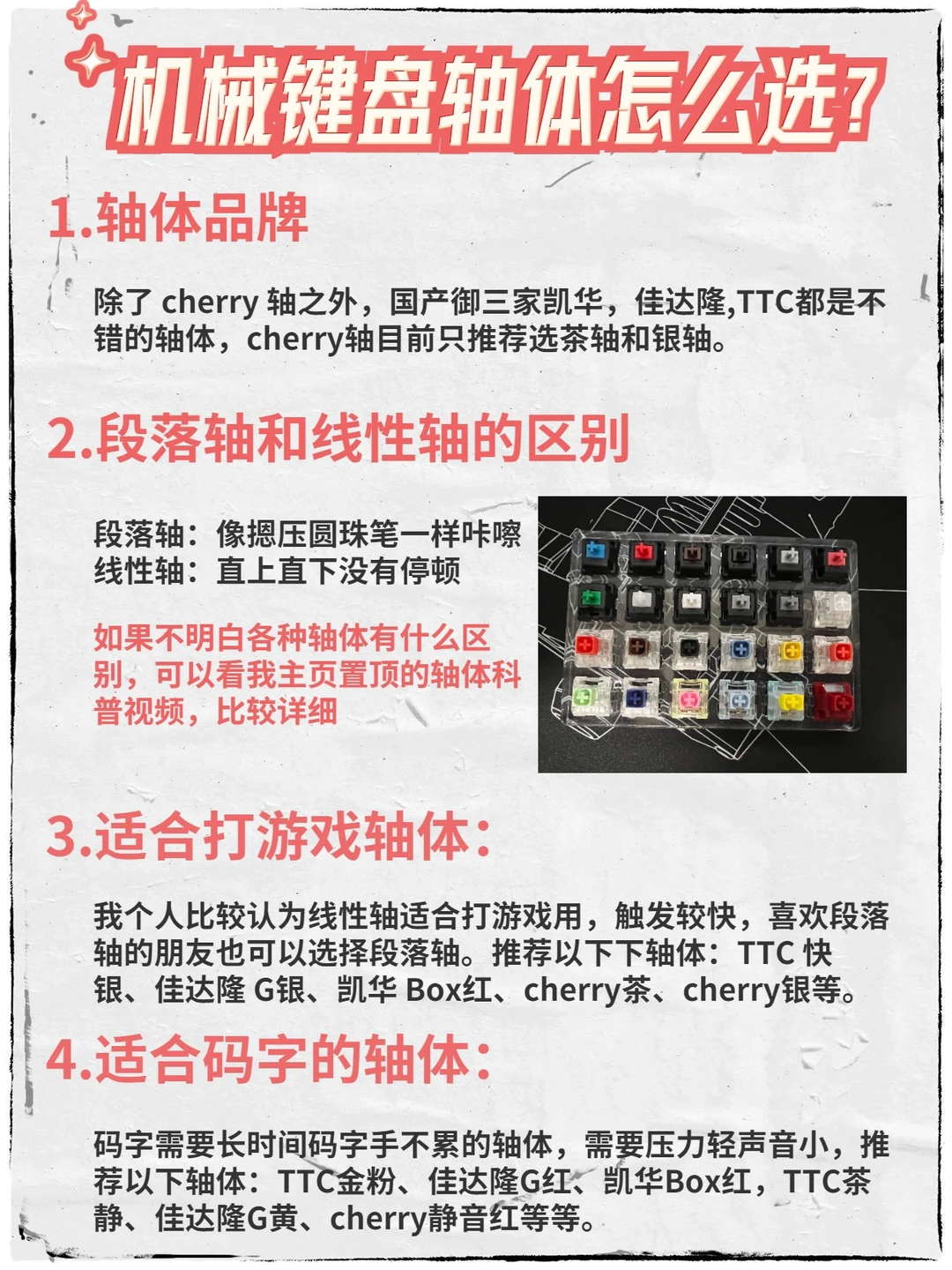 轴体分为段落轴和线性轴,段落轴就是圆珠笔咔嚓咔嚓的有层次感,线性轴就是直上直下的声音小一点,打游戏适合买触发快的线性轴,但是不要听信别人的买黑轴!如果喜欢段落轴也可以考虑买茶轴或者青轴打游戏用,但是尽量不要吵到舍友哦。