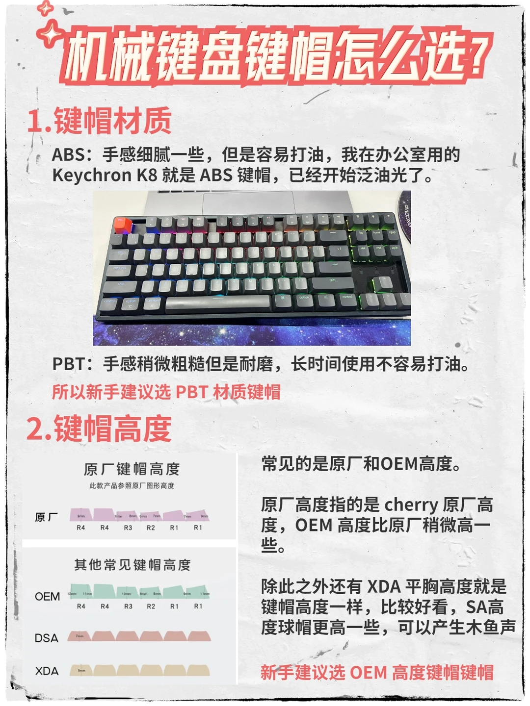 键帽材质有 ABS 和 PBT 键帽,个人推荐新手选 PBT 键帽,长时间用不打油。
