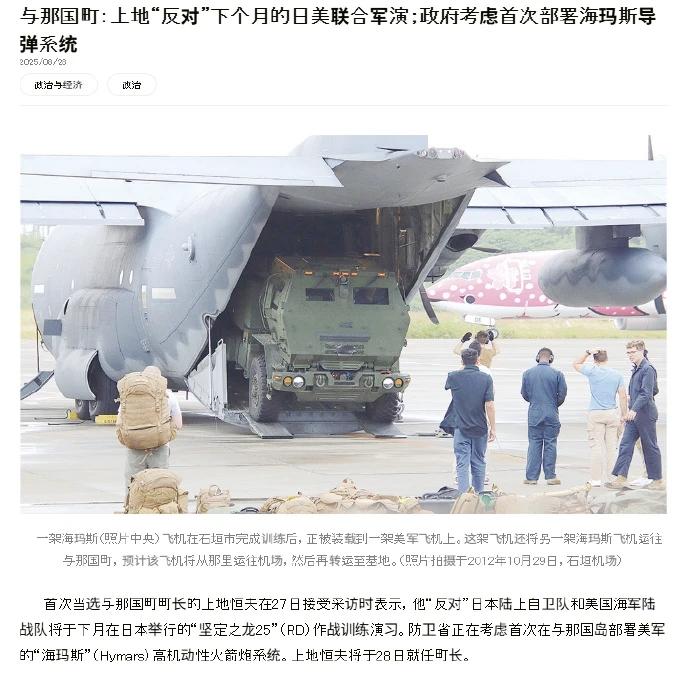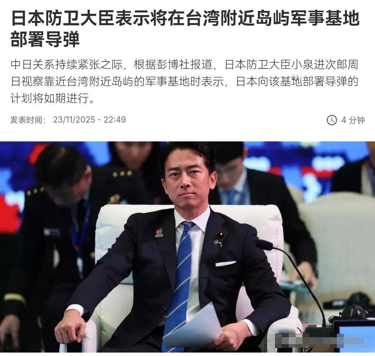 11月26日,据央视新闻客户端报道,11月25日,日本防卫大臣小泉进次郎视察琉球群岛一处日本军事基地表示,日本将如期在该基地部署中程防容导弹。 该军事基地所在的与那国岛距离台湾只有110公里,此举刻意制造地区紧张,挑动军事对抗,联系到近日日本首相高市早苗涉台挑衅、错误言论,这一举动极其危险、极其恶劣,需要周边国家及国际社会的高度警惕了! 项庄舞剑,意在沛公。日本在与那国岛部署中程导弹针对性极强,奉劝日本政府不要铤而走险,玩火者必自焚。[呲牙][呲牙][呲牙][呲牙][呲牙][呲牙]