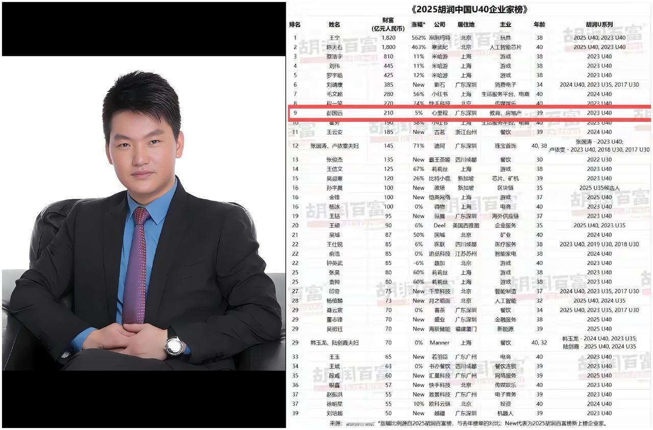 215亿!他偷偷拿25万离家,9年后为何反手收购了父亲的企业?这个“85后”广东仔,凭啥这么牛? 彭国远登上了《2025胡润U40企业家榜》第9名,财富高达210亿。这事儿,乍一看是又一个年轻富豪的成功故事,但细品之下,你会发现他走的根本不是寻常路,简直是给当下年轻人“打了个样”。 他干的几件事,特别有说头。 第一,他重新定义了“富二代”。 按老剧本,他英国留学回来,就该乖乖接手老爸的家族企业。但他偏不!为啥?就叁字:不喜欢。 他觉得老爸干的装修装潢不是自己的菜,反而对电子数码产品爱得不行。于是,他揣着25万,偷偷跑到上海,从在福特发传单开始,到自己创业卖GPS导航仪,硬是白手起家,自己闯出了一片天。 最绝的是,后来他事业做大了,反而回头把父亲的公司给收购了,还请老爸来给自己当CEO。 这说明啥?真正的传承,不是接你的班,而是接你的胆! 他从父辈那里继承的不是现成的公司和存款,而是那股敢闯敢干的“粤商精神”。这给所有“创二代”打了个样:别总想着躺平接班,拿出你的本事,把你爹拍在沙滩上,那才是真本事! 第二,他把“政企合作”玩出了新高度。 很多民企老板,一听到和国企合作就头大,觉得规矩多、不灵活。但彭国远不一样,他反其道而行,主动拥抱“混合所有制改革”。 简单说,就是和政府国资一起成立公司,你中有我,我中有你。 这招有多高明? ①对民企来说:相当于有了一张“国家队”的信用背书,去各地谈生意,信任度直接拉满,进门容易多了。 ②对国企来说:注入了民企的“狼性”和灵活性,不再死气沉沉。 这就好比,民企是速度快的“跑车”,国企是稳重宽敞的“红旗轿车”。他现在把两者优势结合起来,造出了一辆既跑得快又坐得稳的“超级战车”。结果就是,心里程集团近五年业绩蹭蹭往上涨,实现了高质量的发展。这不是靠关系,而是靠智慧,找到了1+1>2的黄金组合。 第三,他给传统制造业“换了大脑”。 他起家是卖GPS、平板电脑这些硬件,说白了过去就是个“高级搬砖的”。但他很快发现,光靠硬件卷价格,死路一条。 他眼光毒辣,盯上了教育信息化这个赛道。国家正大力推进“教育强国”,他顺势而为,把自家的硬件优势,和收购来的高端软件结合起来,给学校提供一整套“智慧教育”解决方案。 这下,生意性质彻底变了。他从一个“卖电脑的”,升级成了一个“帮助政府解决教育均衡问题的方案提供商”。他的产品能让城里的特级教师,给山区的孩子远程上课,这格局一下就打开了。 彭国远的成功,不是偶然。他精准地踩中了三个时代节拍: ①打破了“代际接班”的魔咒,证明了精神传承比财富交接更重要。 ②玩转了“国企民企混改”的新模式,找到了在新时期发展的快车道。 ③完成了“从制造到智造”的华丽转身,把硬件生意做成了有社会价值的赋能平台。 所以,彭国远的故事,不仅仅是一个财富故事,更是一个关于如何在这个新时代,聪明地、有担当地把生意做大做强的范本。他告诉我们:成功不是闷头蛮干,而是要有破局的勇气,有顺势的智慧,更要有超越单纯赚钱的更高追求。 这,才是这位85后粤商,给我们最深的启发。