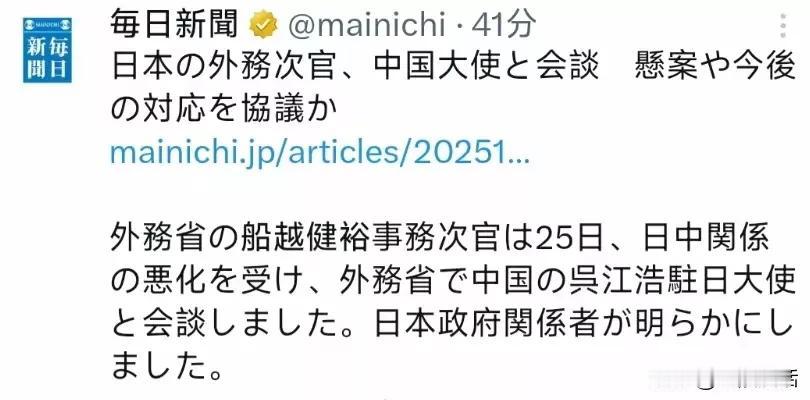 11月25日,日本外务省次官船越健裕与中国驻日大使吴江浩进行了会谈,但会谈的具体内容没有公布。 然而结合当下中日关系的背景以及此前双方互动情况来看,此次会面的核心应该仍然是围绕日本首相高市早苗涉台错误言论展开的,中方大概率再次重申了在台湾问题上的核心立场,敦促日方纠正错误、停止挑衅 。 日本首相高市早苗在国会答辩中发表涉台露骨挑衅言论,将“台湾有事”与日本“存亡危机事态”挂钩,公然鼓吹武力介入台海之后,中方从外交、军事、经济和文化等多个领域进行了回应和反制。中日关系一度降至了冰点。船越健裕与吴江浩的会谈正是在这种大背景下进行的,自然格外引人注目。 虽然此次会面的具体内容不得而知,但还是透露了一个好信息:这就是在当前的紧张局势下,中日双方的外交沟通渠道还是畅通的,这样就可以避免双方误判升级。 不过,从此次会面内容没有透露看,会谈是不太顺利的,这也说明短时间内还难以彻底扭转中日关系的紧张态势。
