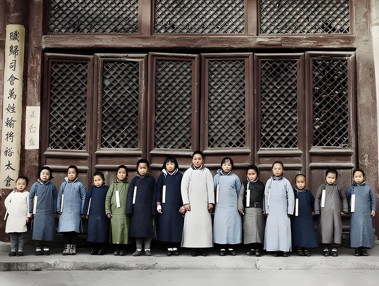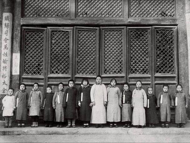 这是张清末内务府上三旗包衣选秀的照片,画面中十二名梳着齐眉短发的少女,身着深色斜襟长袄与浅色长裤,脚踩布鞋,整齐列队于府邸雕花格栅门前。 她们腰间系着写有姓名、旗籍的纸质腰牌,年龄从十岁左右到十五六岁不等,最小的女孩站在队首,身形尚未完全舒展,双手拘谨地垂在身前;年长些的少女则目视前方,表情或麻木或略带紧张。 这些女孩均来自镶黄、正黄、正白三旗包衣家庭(皇室家奴群体),此次参与的选秀不同于八旗选秀,自康熙十六年(1677 年)起确立 “三年一选” 制度,专为宫廷选拔宫女与杂役,参选者需符合十三岁左右的合例年龄,且需外表周正、身体健康无残疾,经本旗佐领造册上报、内务府会计司初审及体貌健康检查后,合格者将录入 “宫女子” 备选名册,或分配至皇家宫苑承担杂役,或被赐给宗室为侍妾,未入选者则需等待内务府发放 “放牌” 文书后才能自行婚配。