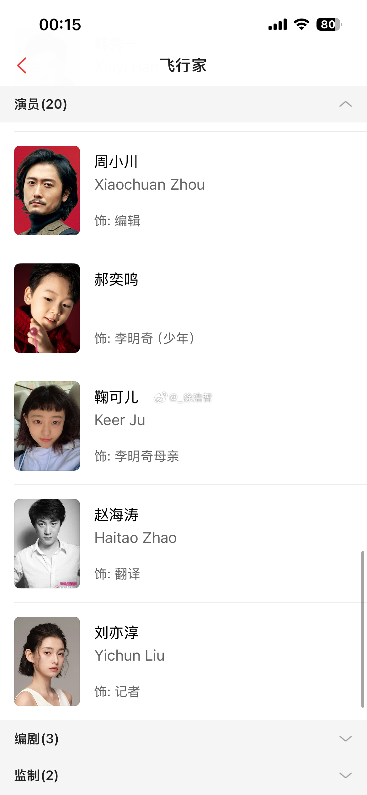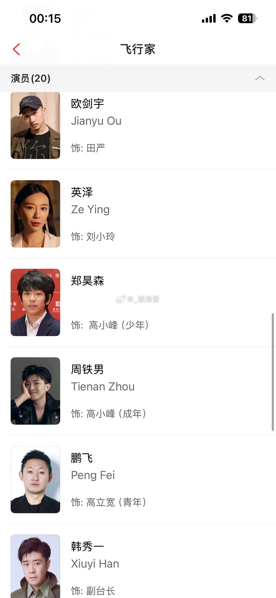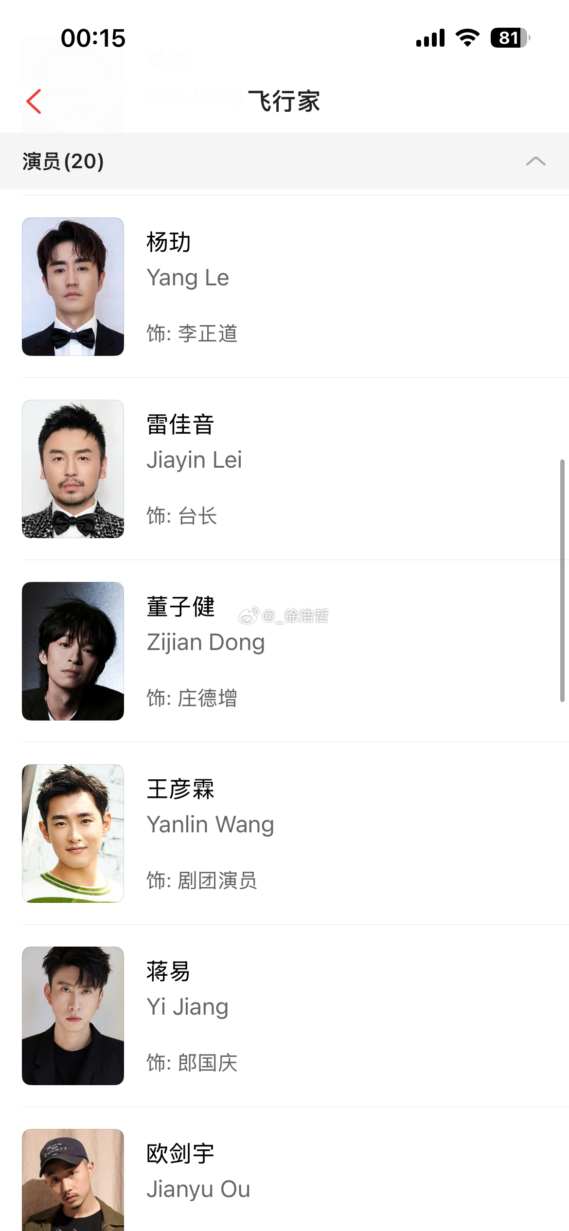 电影《飞行家》更新演员表除了已知蒋奇明、李雪琴领衔主演外董宝石(老舅)、姜武、杨玏、雷佳音、董子健、王彦霖、蒋易、欧剑宇、英泽、郑昊森、周铁男、鹏飞(本片导演)、韩秀一、周小川、郝奕鸣、鞠可儿、赵海涛、刘亦淳出演